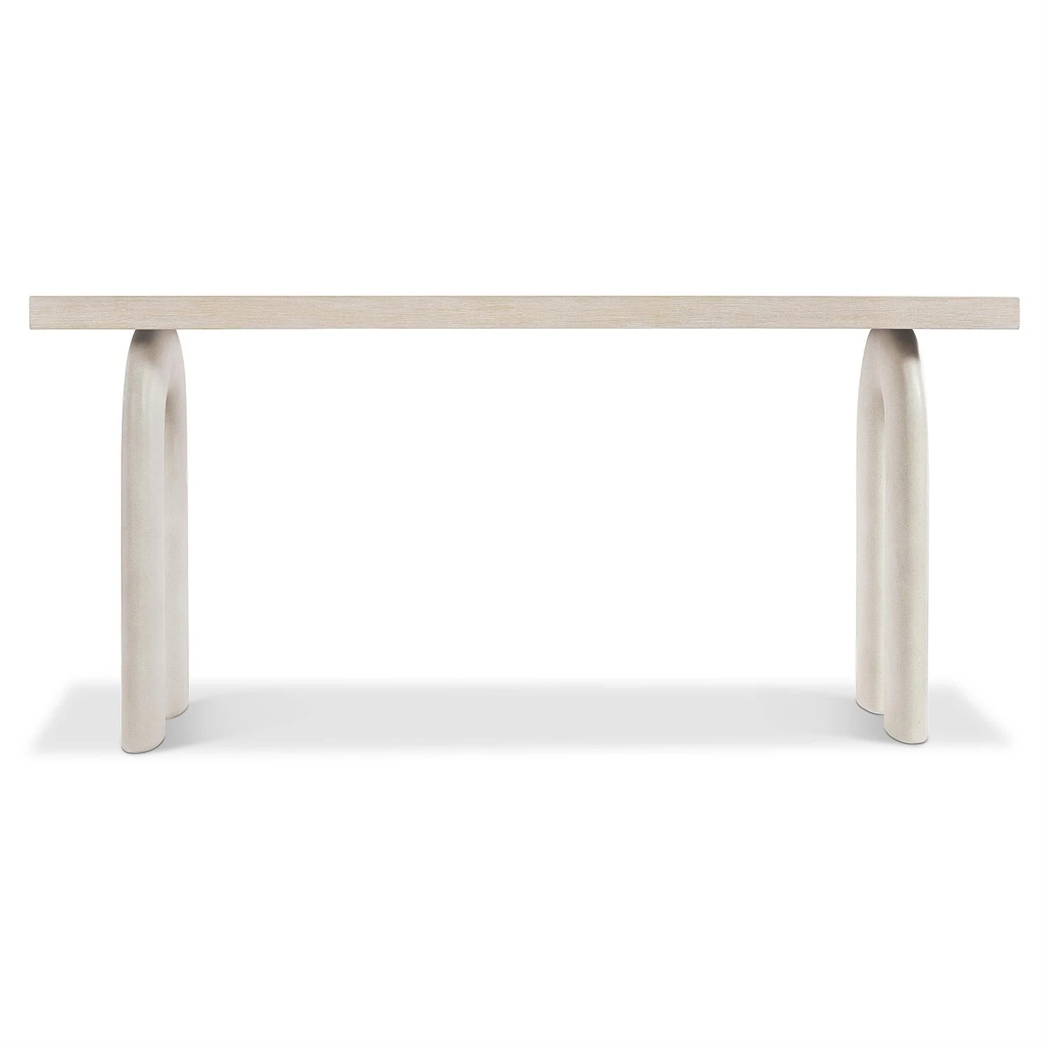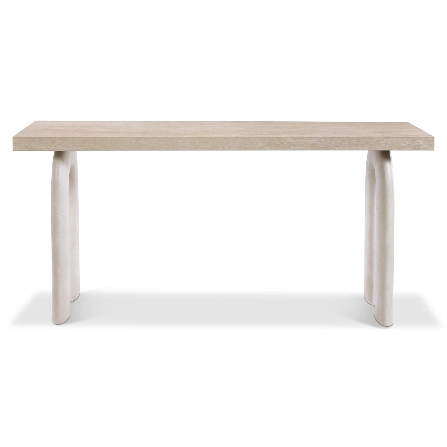 Elongated, arched legs give the Antibes console table its distinctive design. Formed of textured, glass-reinforced concrete, they balance a wood top in the light oak Roz finish. Its a light and serene style that offers monolithic beauty.