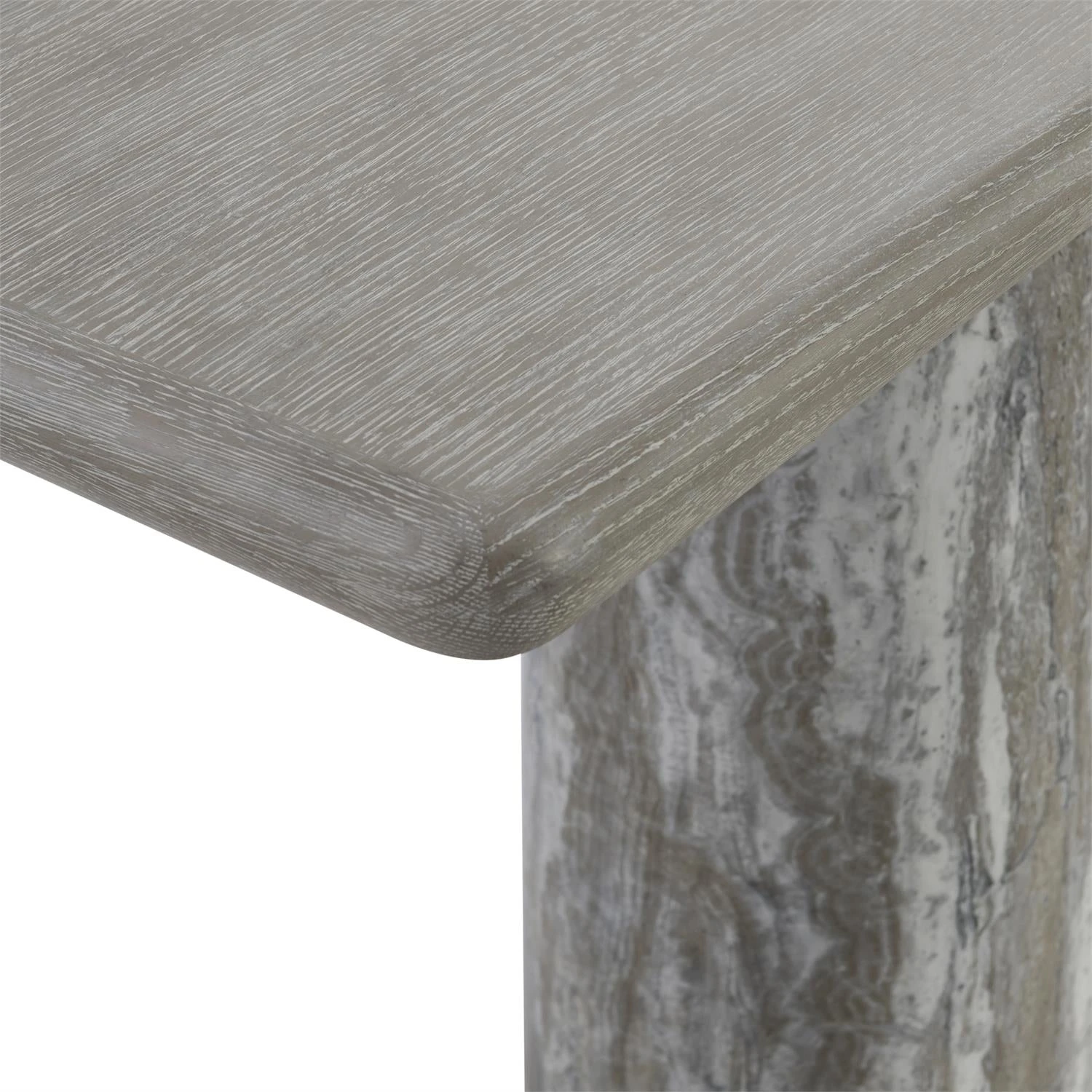 Organic drama is the signature of the Arcadia console table, with a monolithic faux stone pedestal base in Kalta finish. The column supports a cantilevered wire-brushed oak top in Clay finish and rests on a matching wood base.
