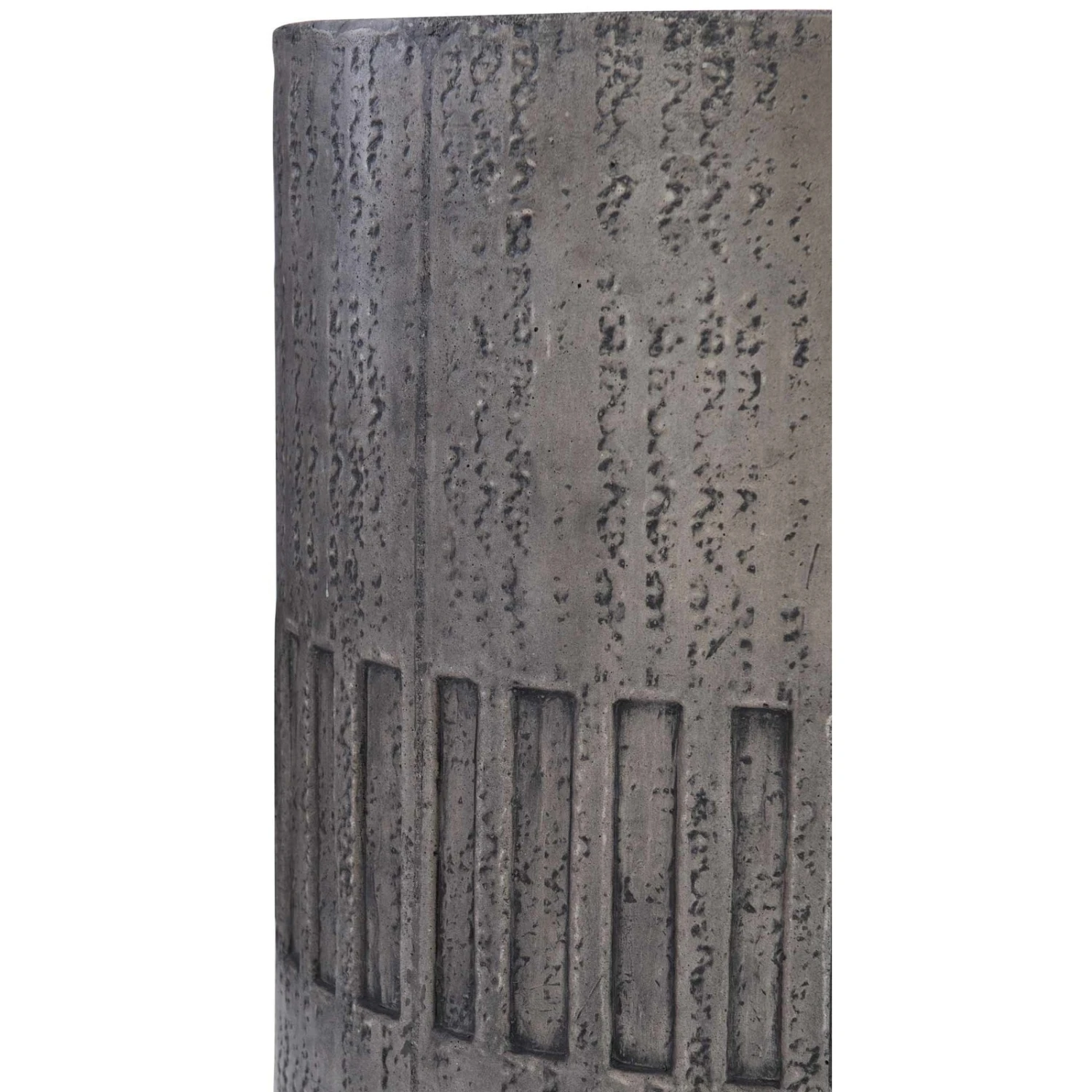- Crafted from textured concrete in a dark charcoal finish, it features rustic irregularities and an etched geometric pattern.