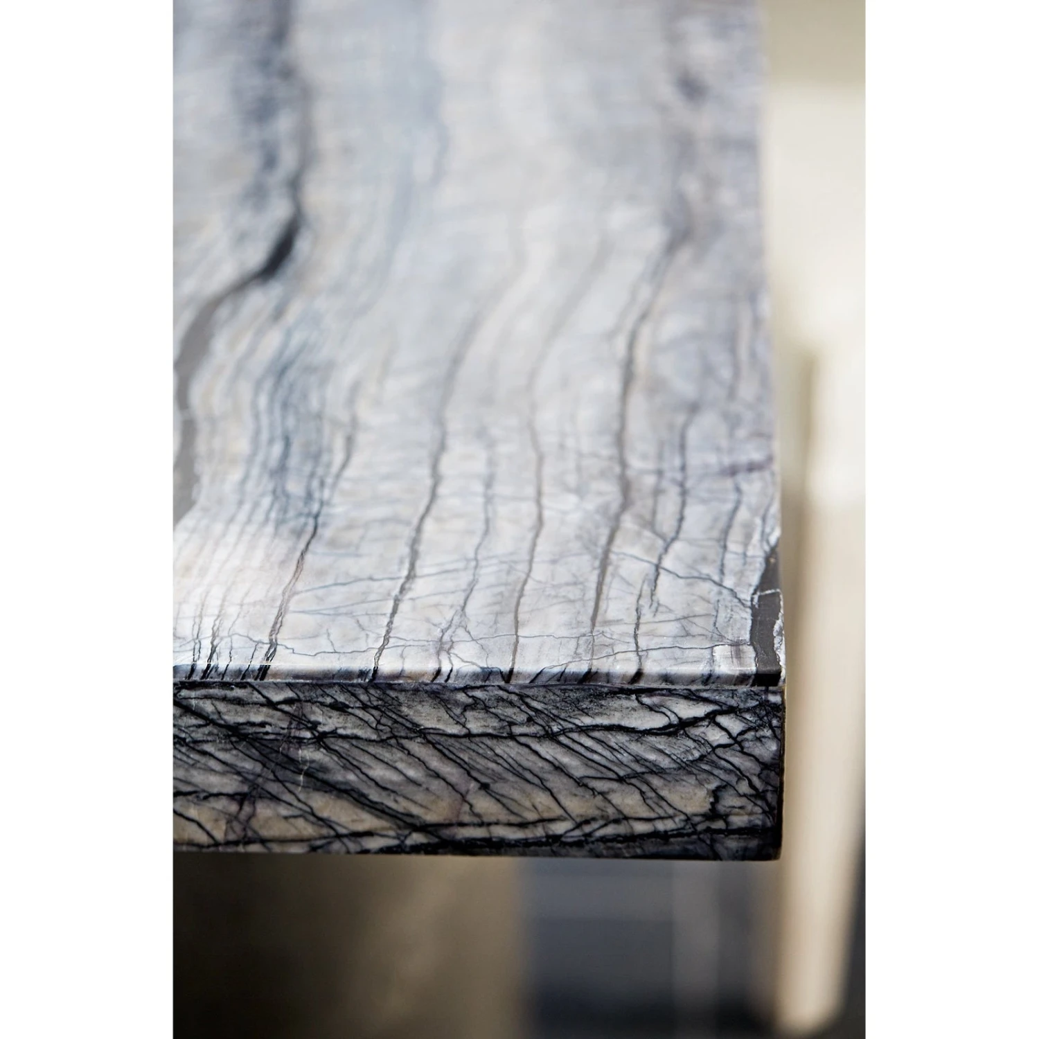 - With its deep charcoal background and snow-white striations, the marble lends a high-end, elegant look.