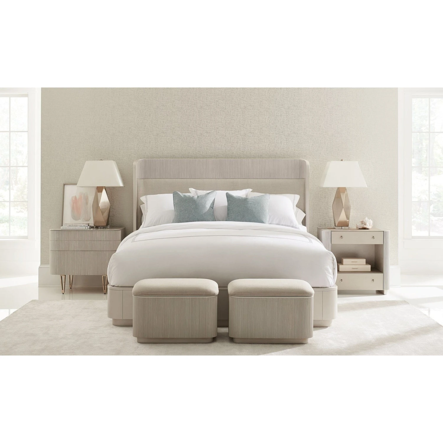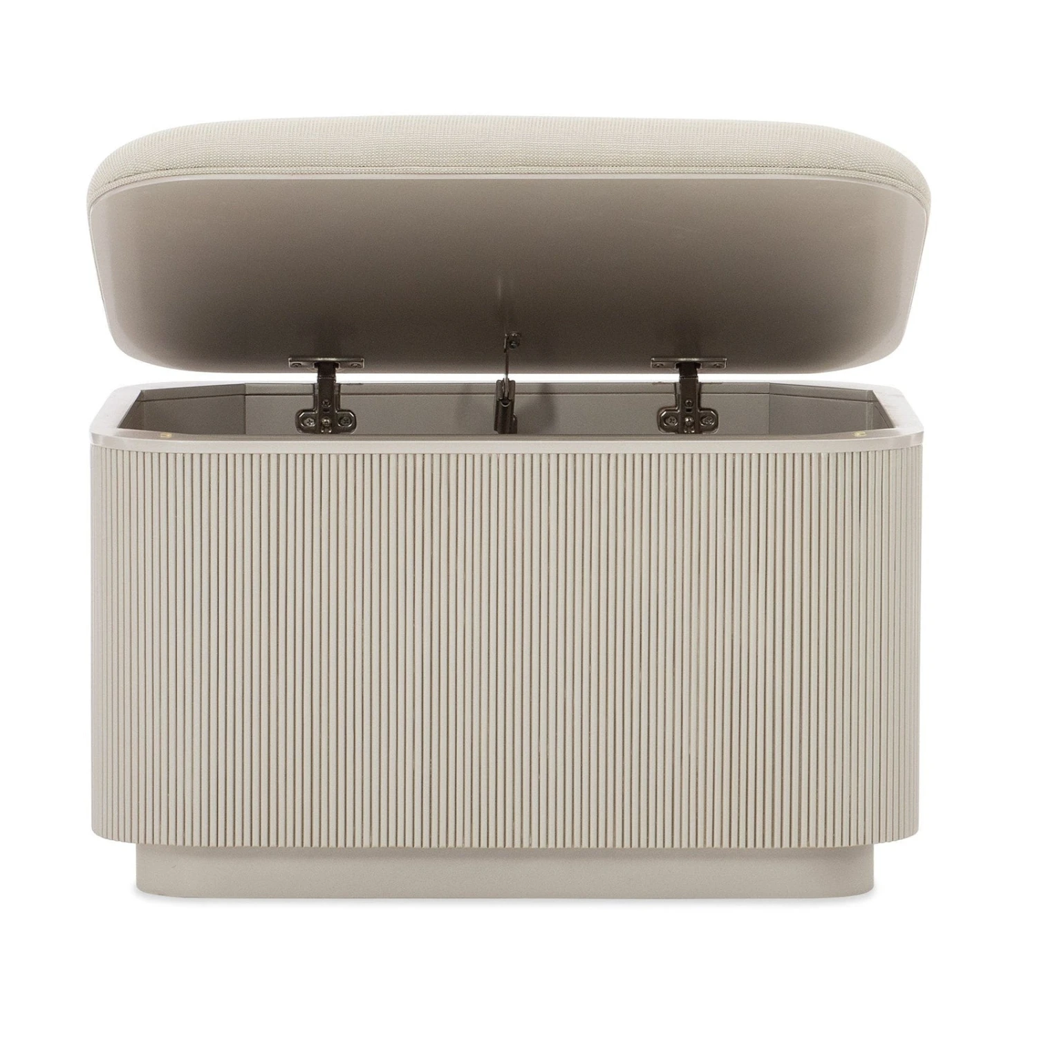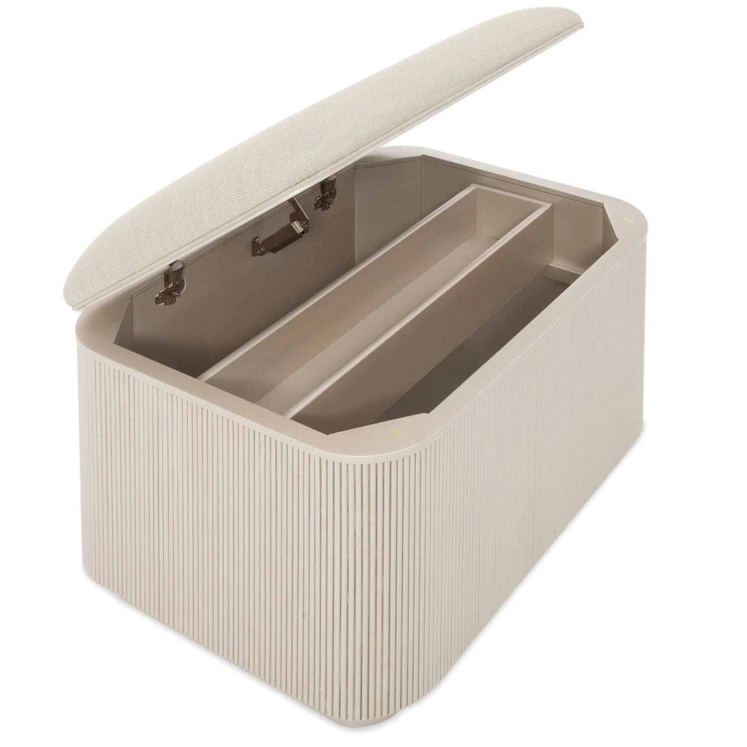- Upholstered in a sophisticated neutral fabric, its top seat cushion opens to reveal multi-level storage.