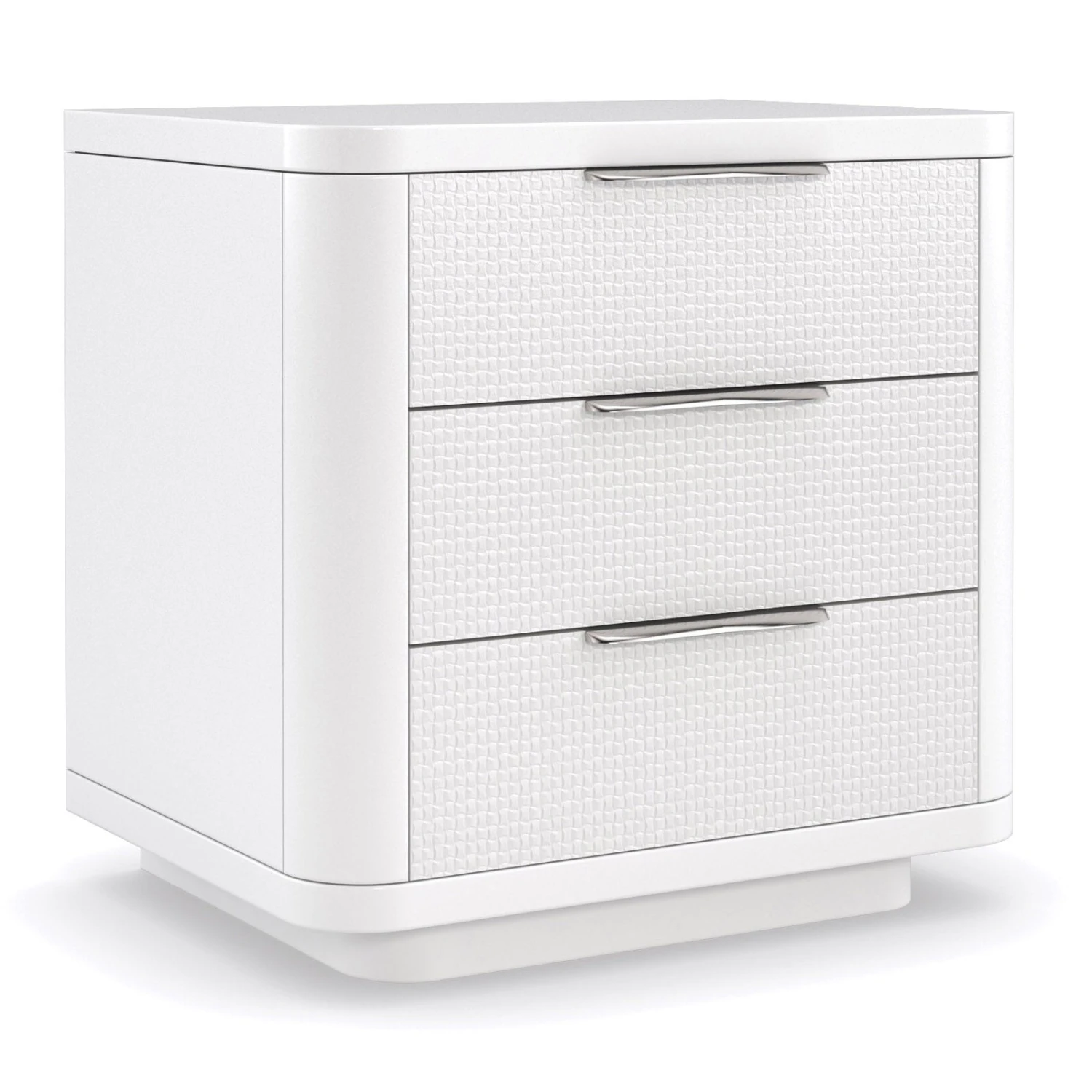 - Quietly captivating in a Cloud White finish, this nightstand features rounded edges and a welcoming texture.