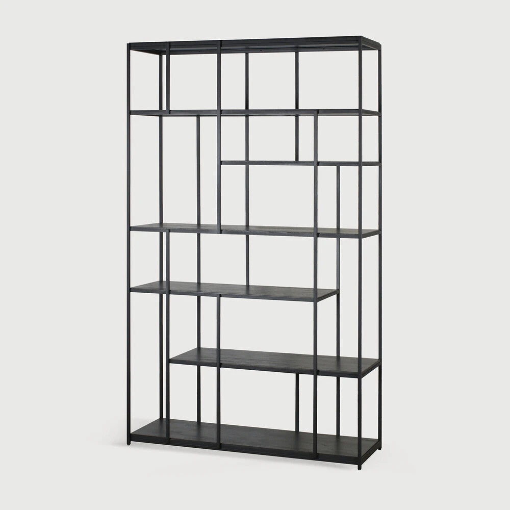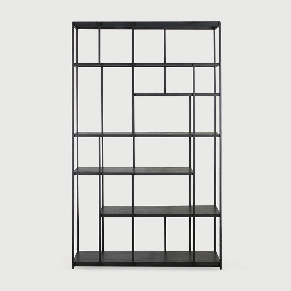 Made from black tainted solid teak with a varnish finish and a black metal frame.