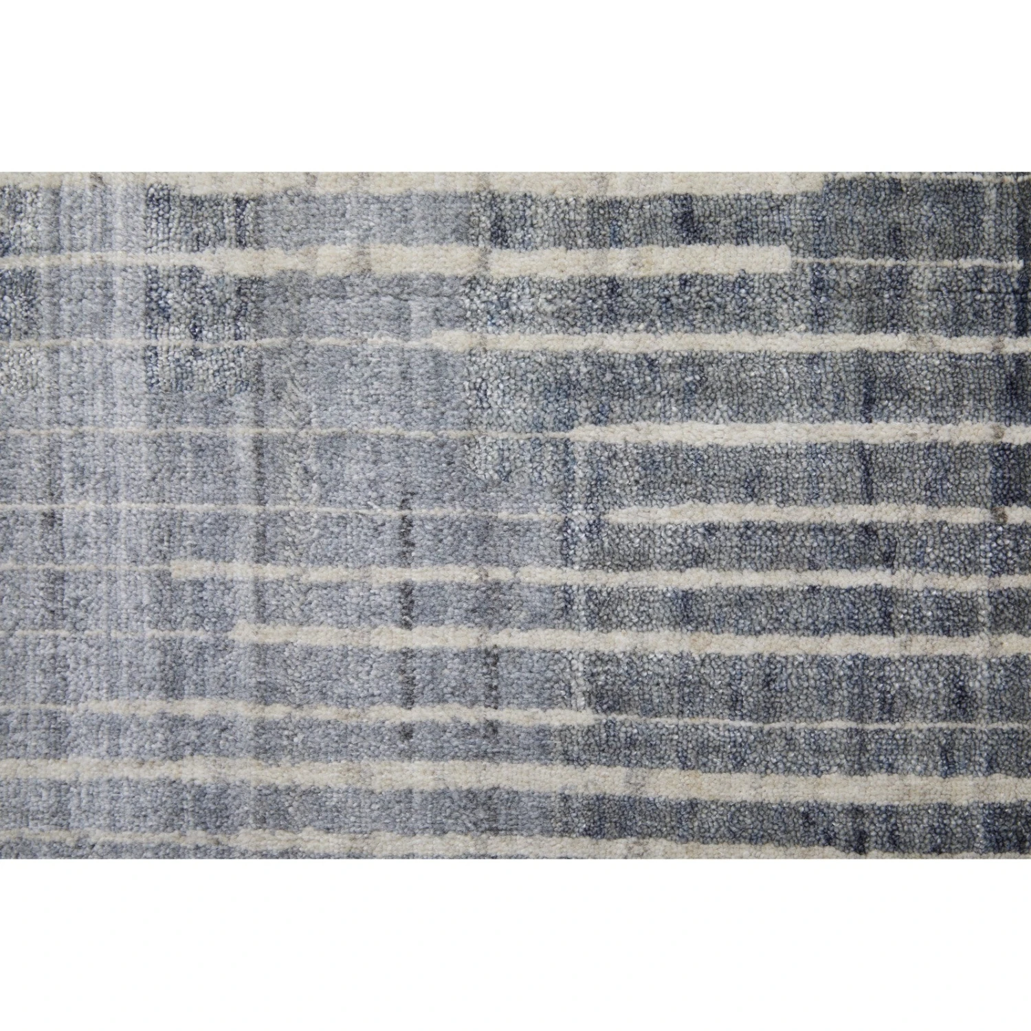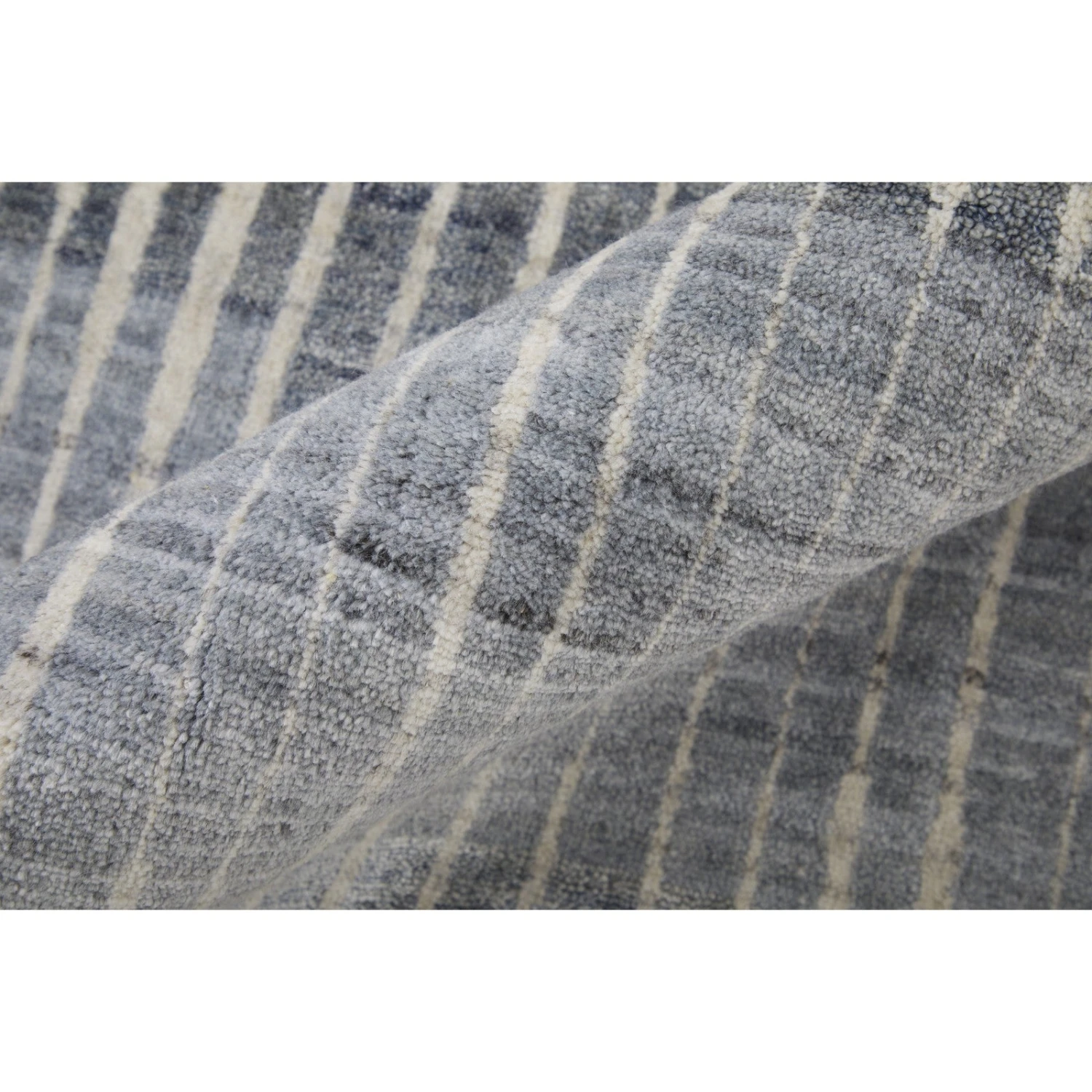 - The hand-loomed construction offers a cost-effective alternative to hand-knotted rugs, featuring an abstract, distressed pattern in a blend of blue, silver, gray, gold, and ivory.
