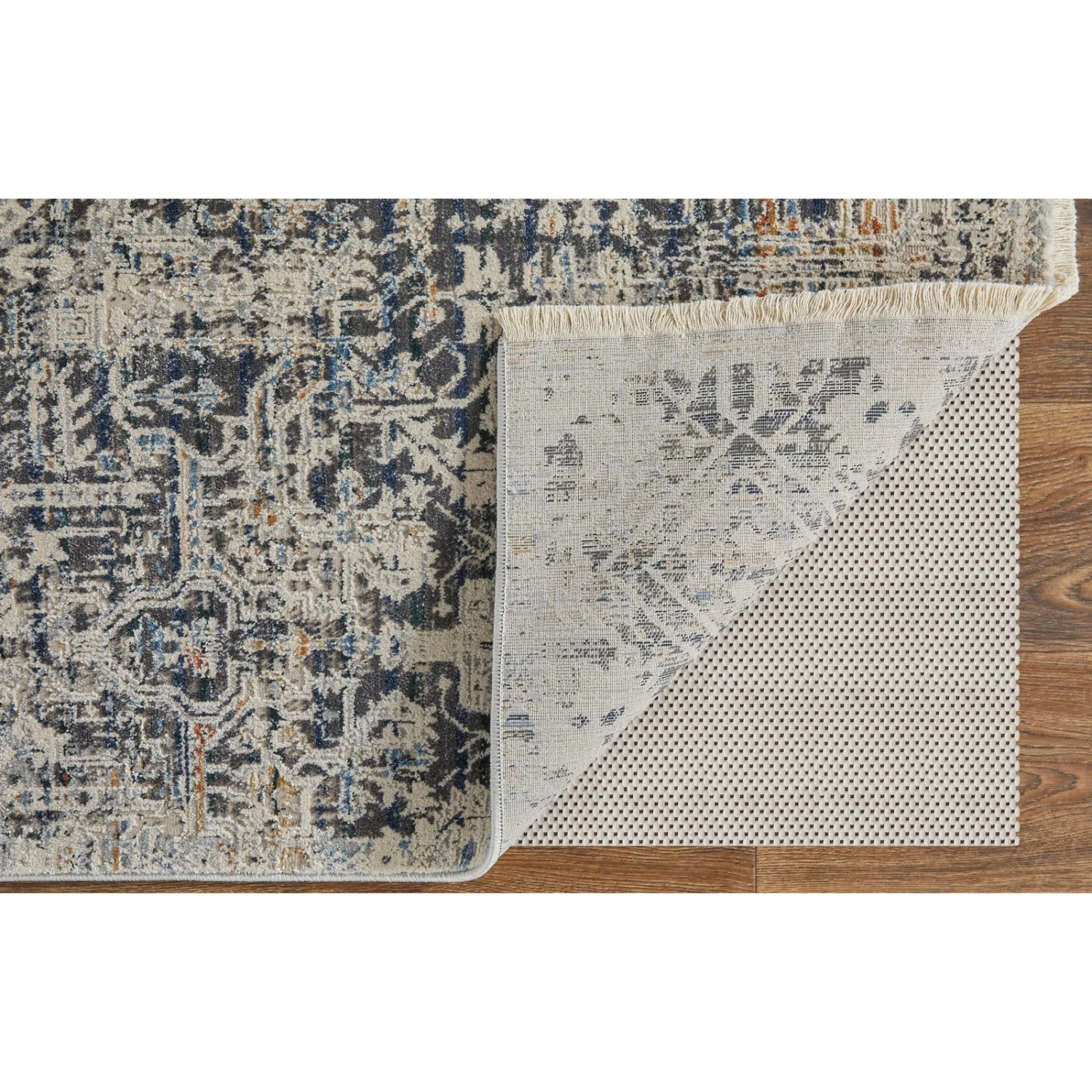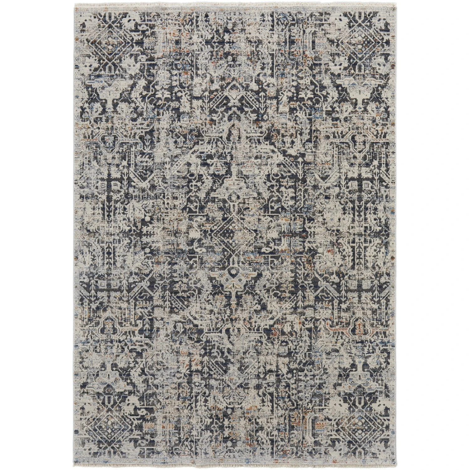- The distressed, traditional and transitional inspired pattern of the rug comes in neutral colors of light blue, warm gray, and ivory.