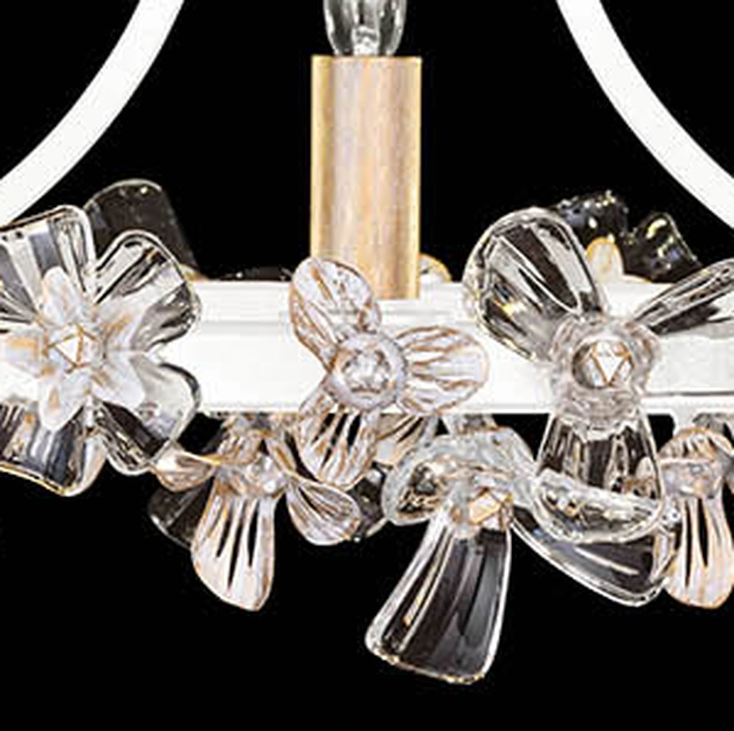 - This chandelier features a flirtatious interplay of crystal with white and gold brushed metal floral adornments creates a romantic atmosphere emanating feelings of joy and the celebration of life.