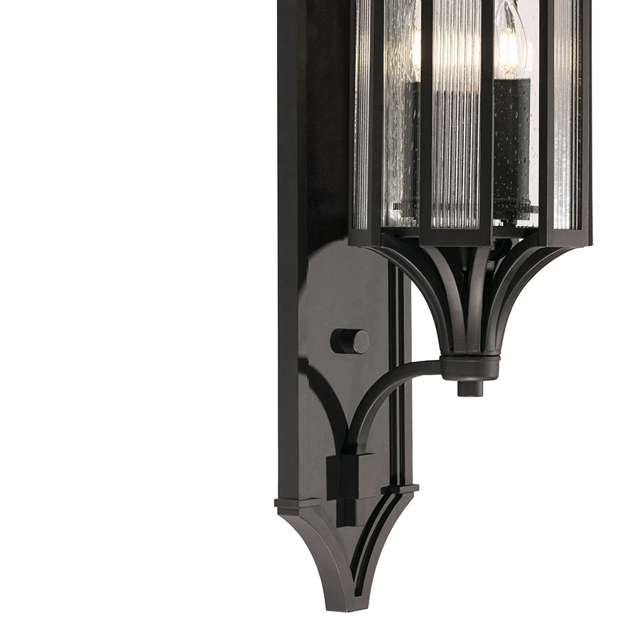 - Boldly designed yet quietly subtle, this outdoor wall mount features seedy inner glass with an overlay of reeded glass panels.