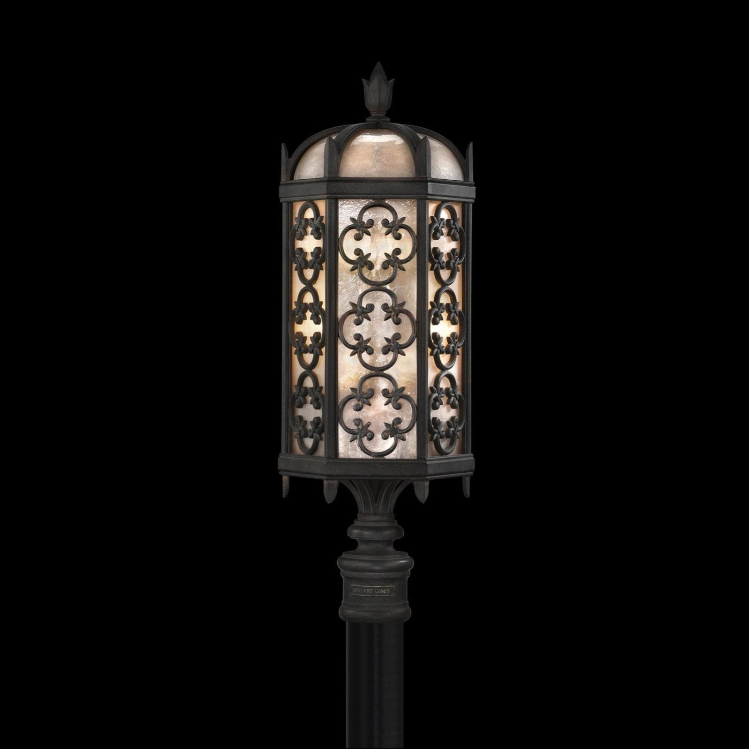 - Post mount in stylized quatrefoil design features Marbella wrought iron finish and subtle iridescent textured glass.