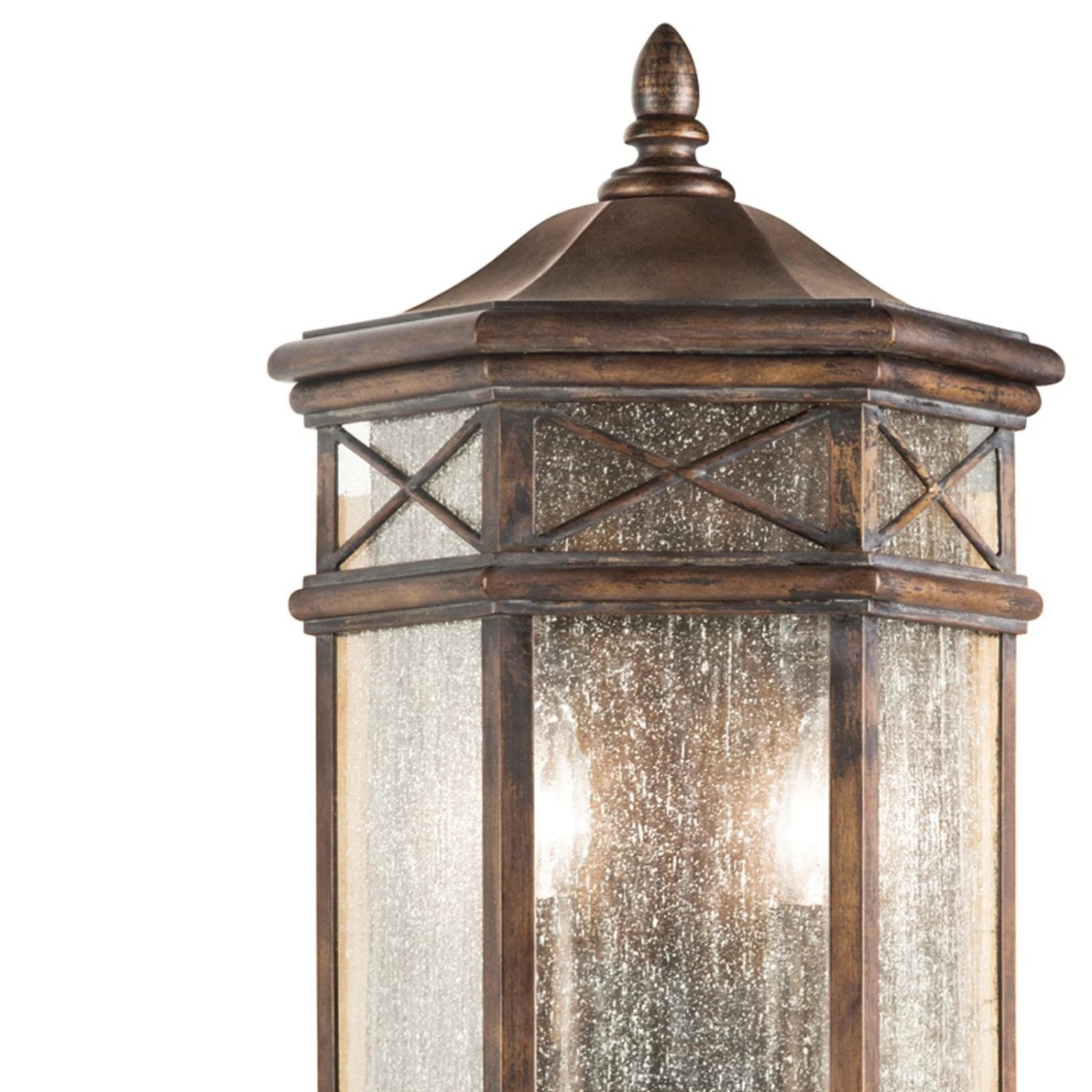 - Classical Greek inspired hexagonal aluminum wall mount in a warm antique bronze finish with hand cast seedy glass and romantic candles.
