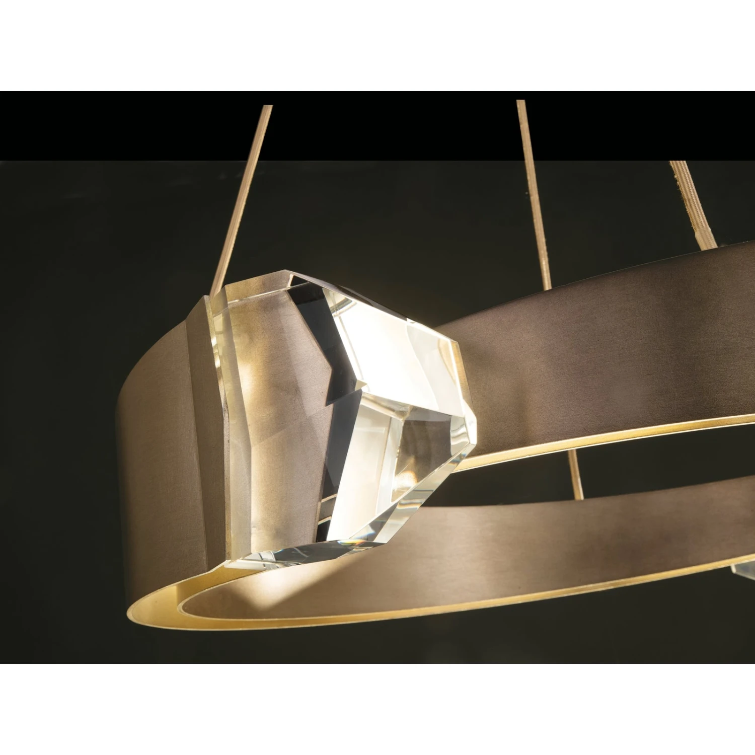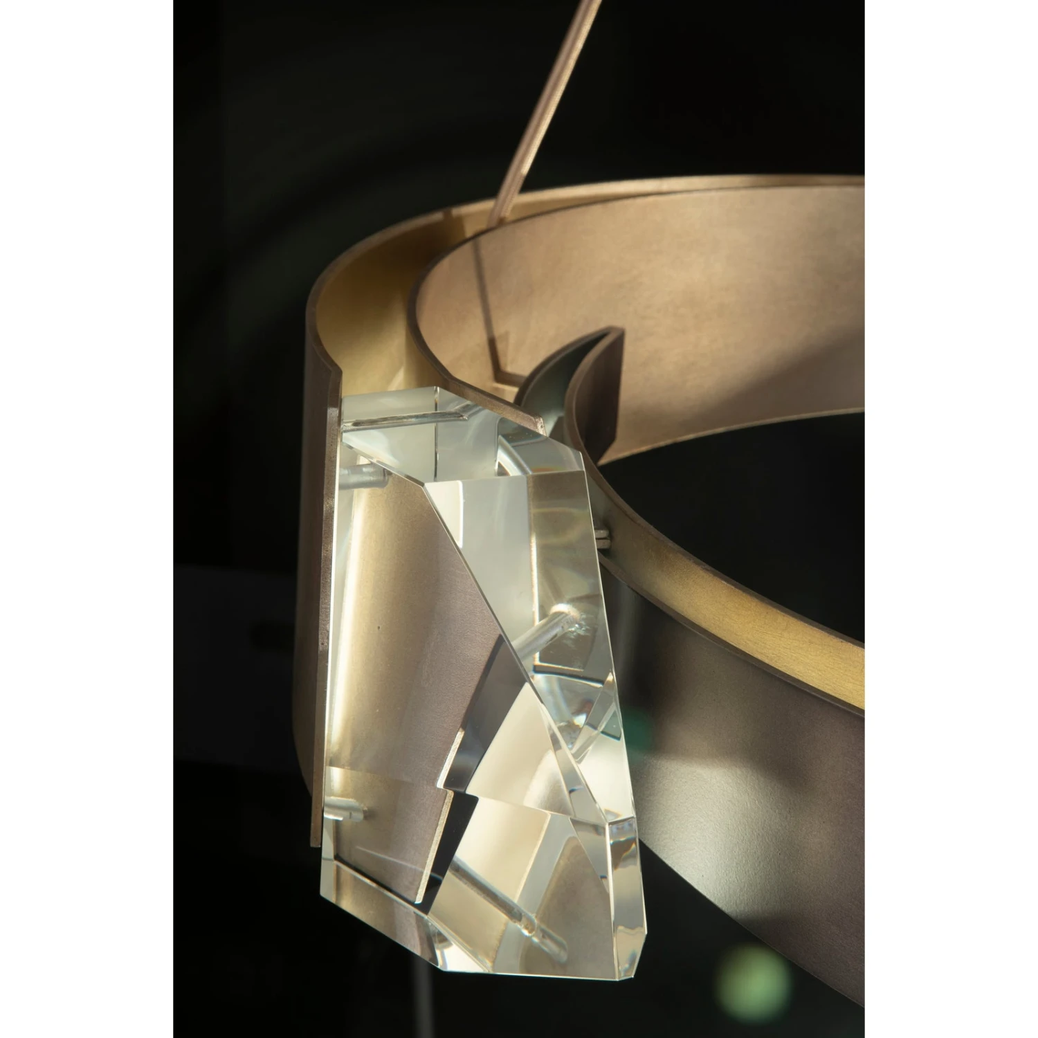 - Sculptural pendant featuring two LED illuminated hand-carved crystals.
