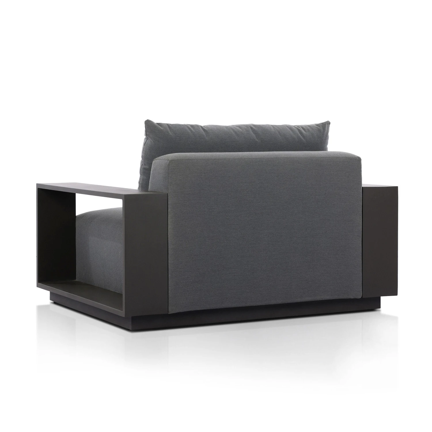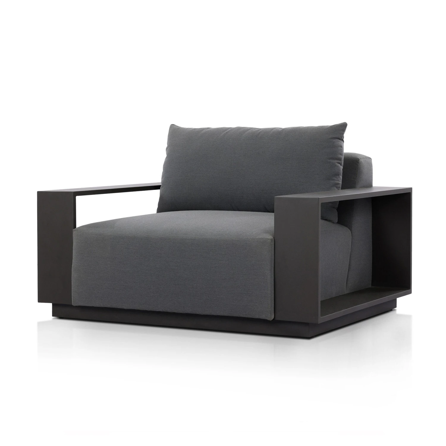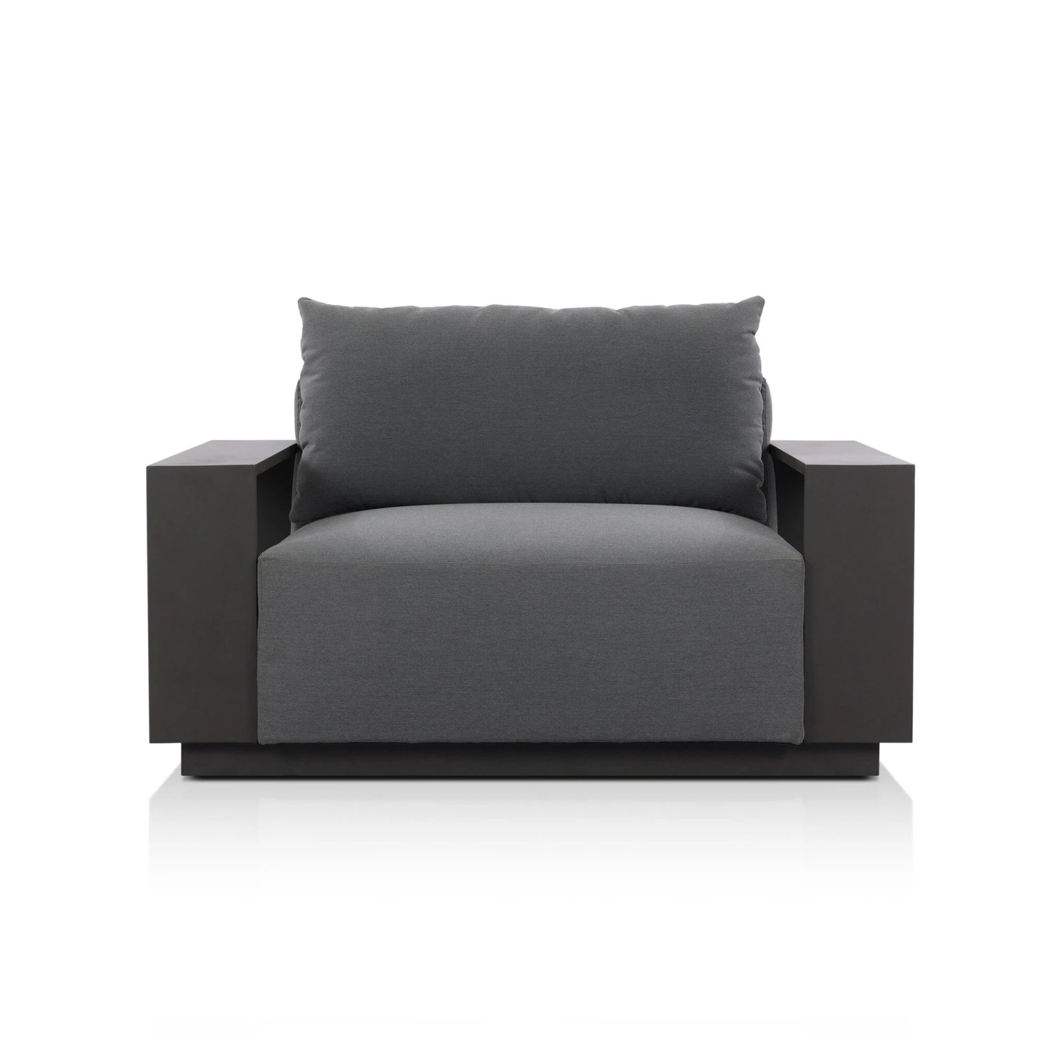 - This wide format outdoor chair features heavy metal framing and upholstery with an inviting sit