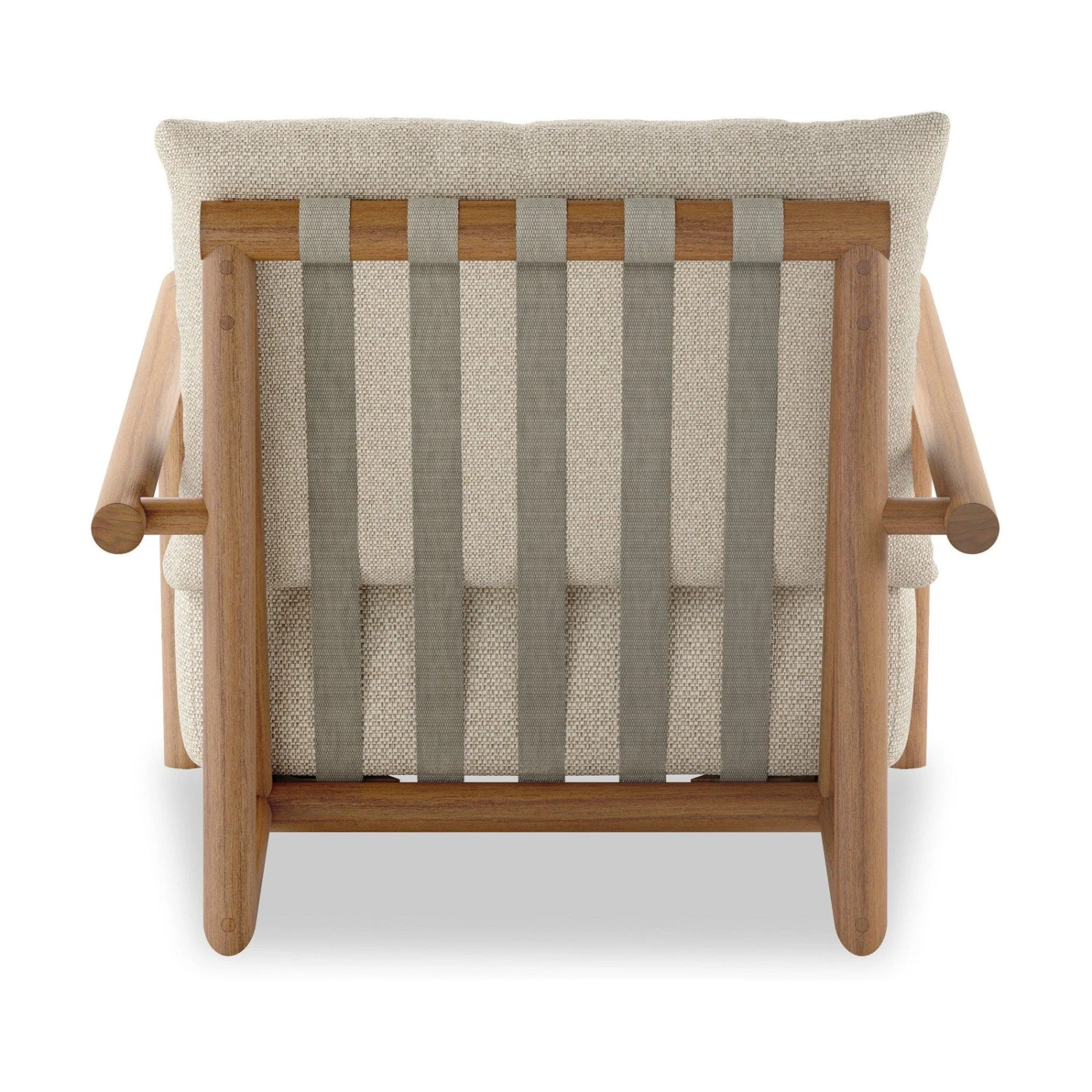 - Strap detailing supports the loose, knife-edge back cushion, complemented by a heavy fixed seat cushion – adding a touch of weight to the airy design.