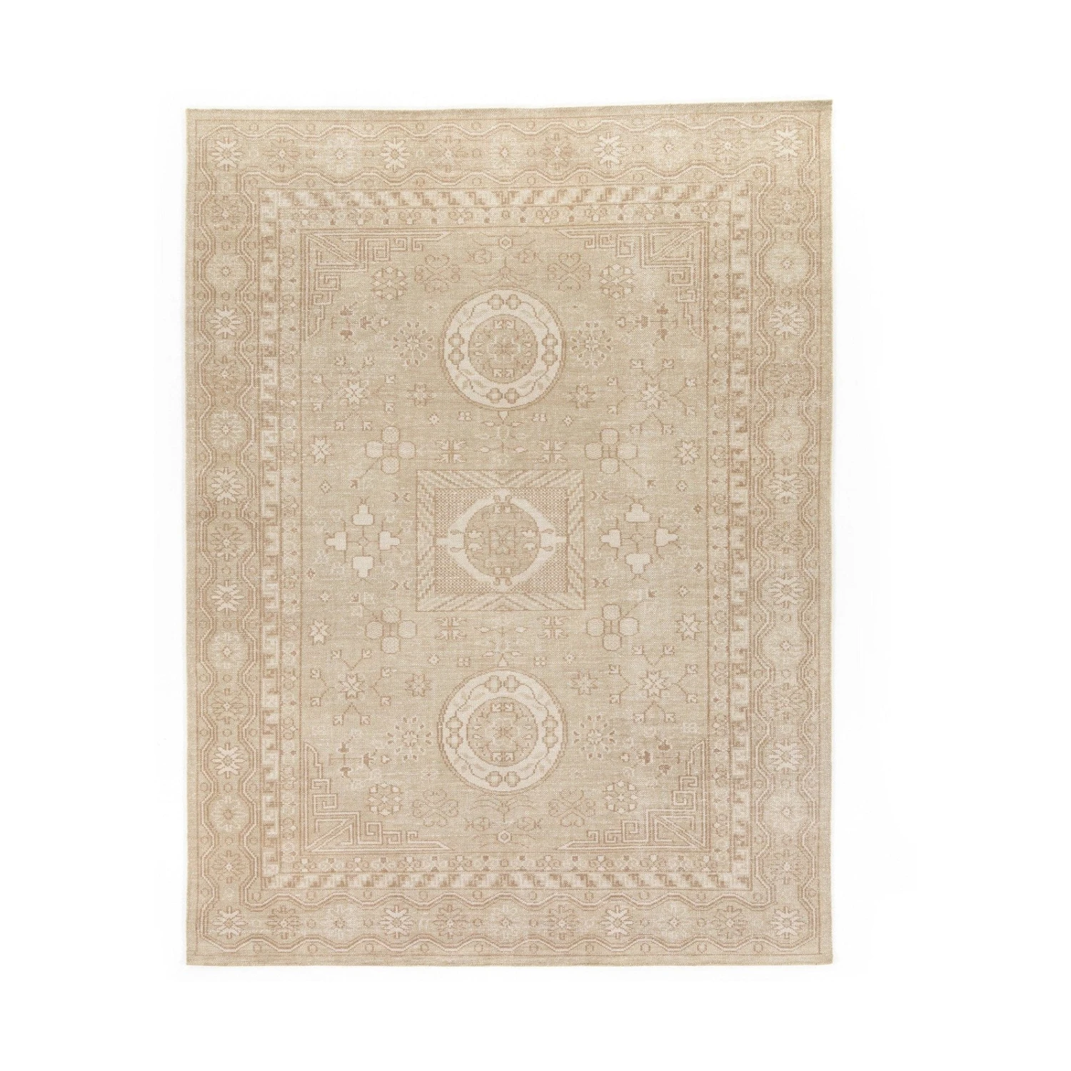 - handwoven in the ancient city of Khotan and designed with wave and fret patterns or flowering vines along the borders.