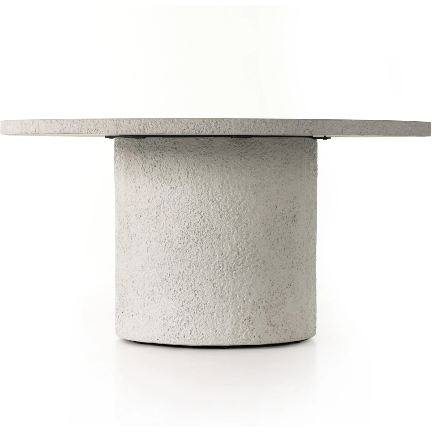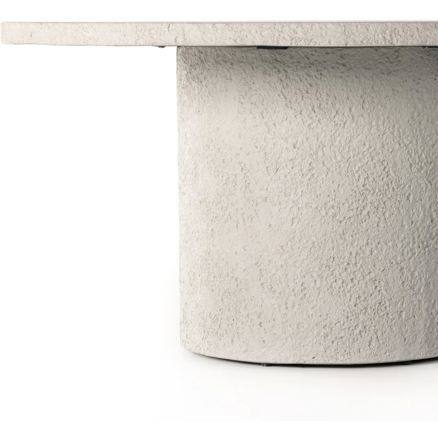 - A monolithic dining table of solid white concrete features raw edging for texture and novelty alike, with a smooth, clean surface.