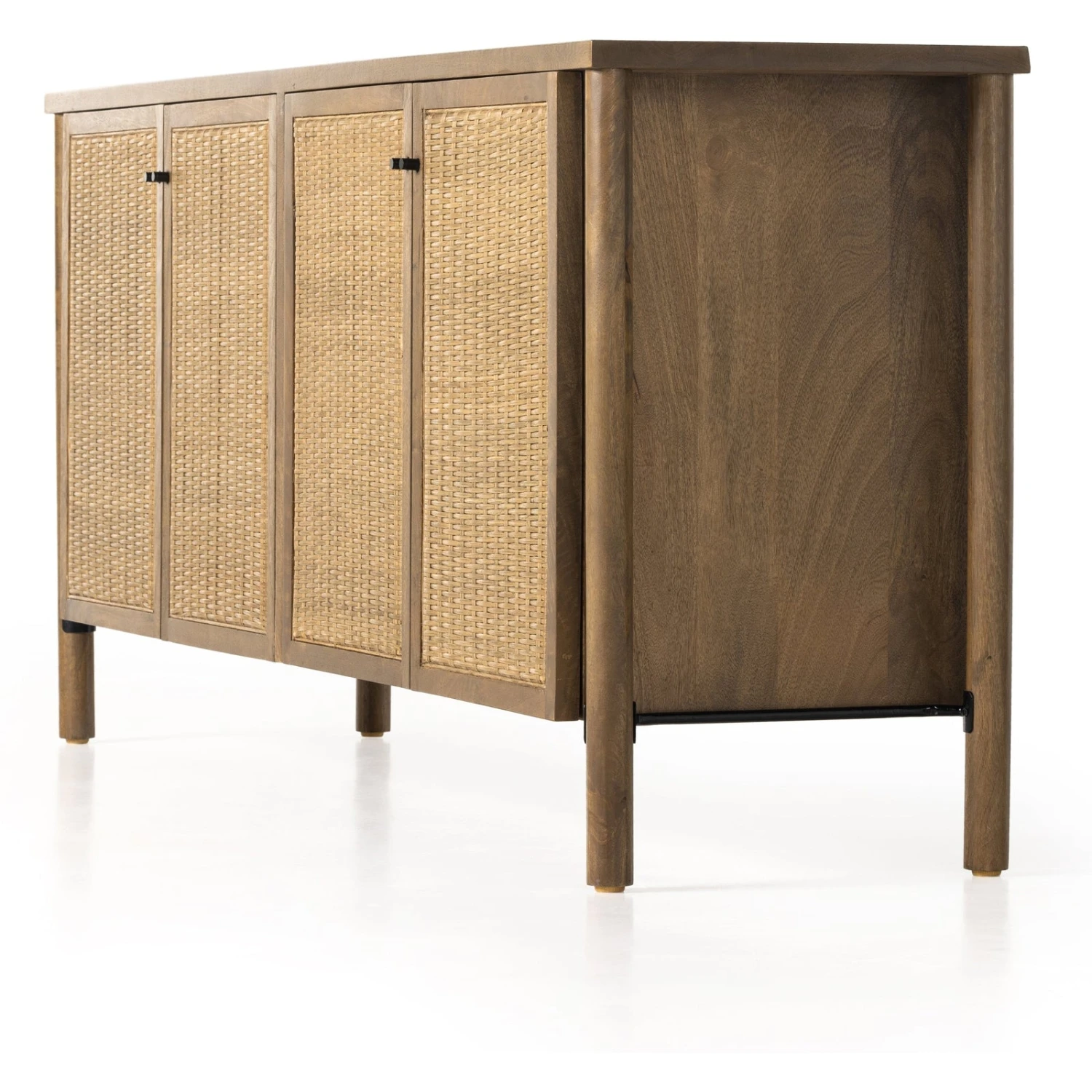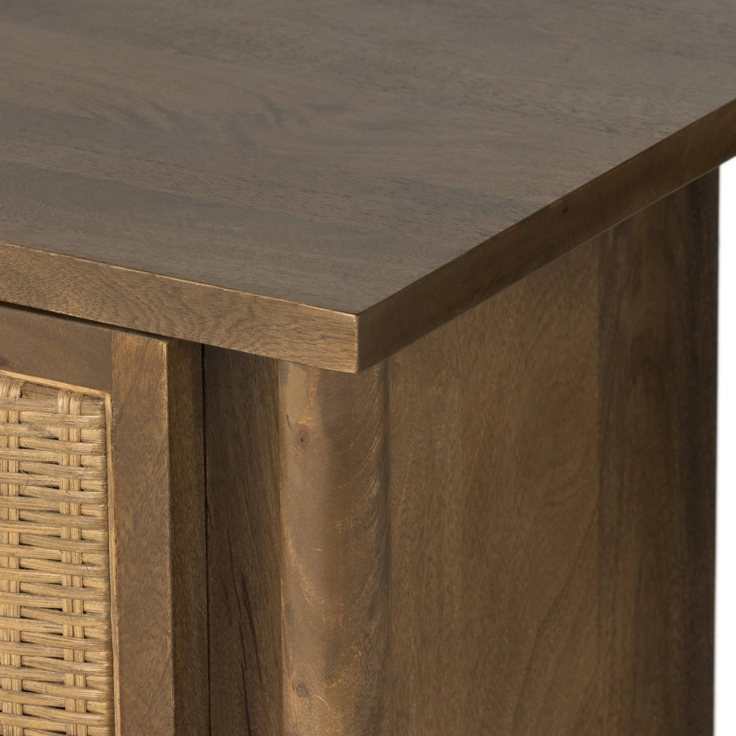 - Solid mango encases cane door fronts with a unique taupe finish and textural basket weave.