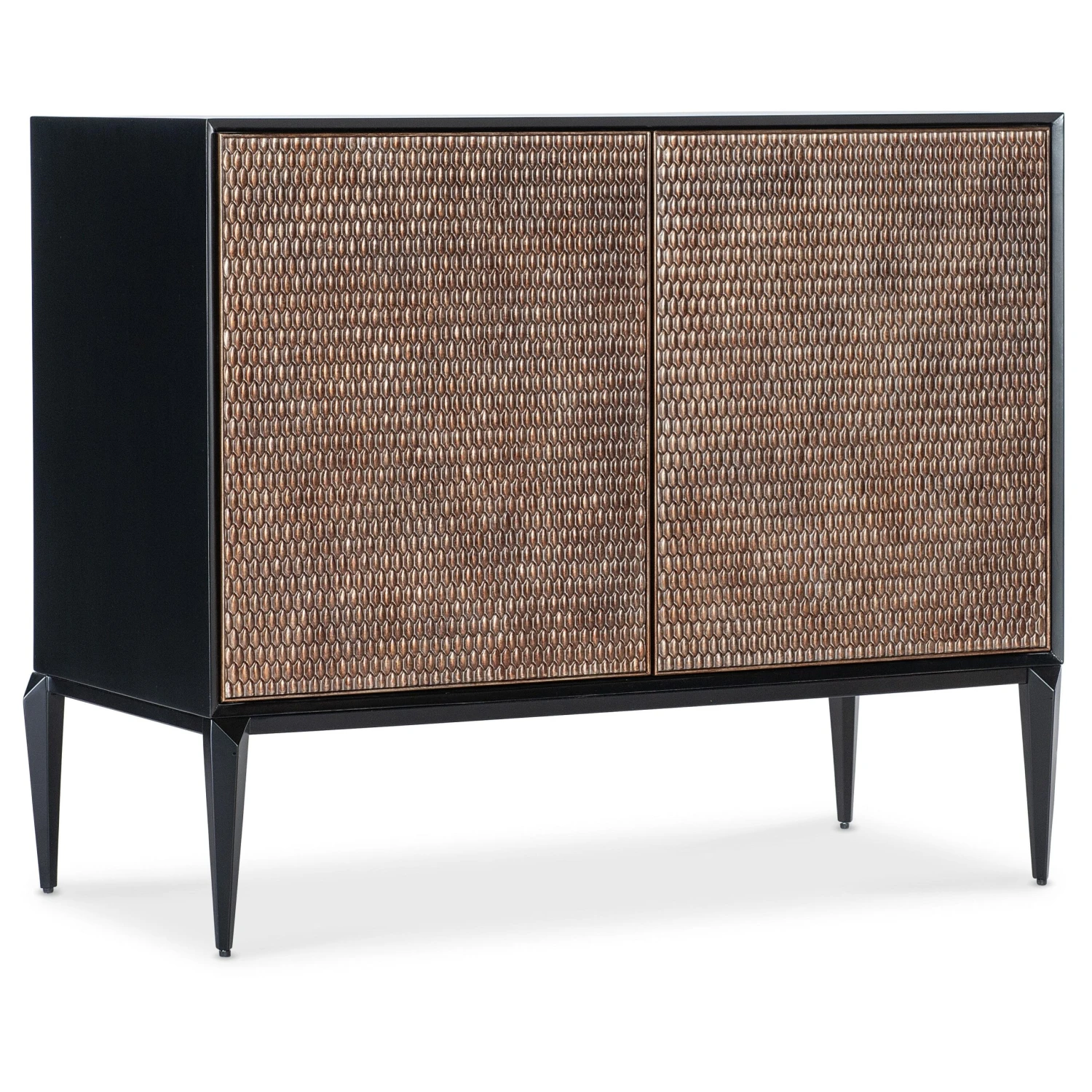 - A clean design with tapered legs crafted of Maple Veneer with a black exterior, the chest has a contrasting warm brown interior and carved door fronts in a basketweave motif