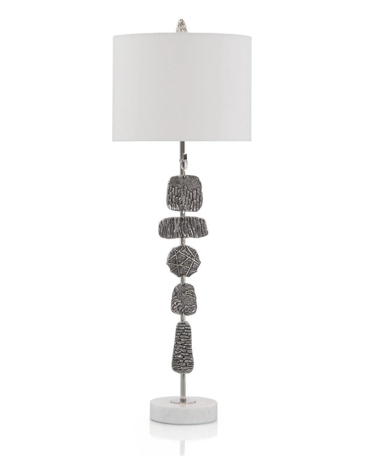 - This table lamp features textured, ornamental, hanging medallions in polished nickel and a white marble base.
