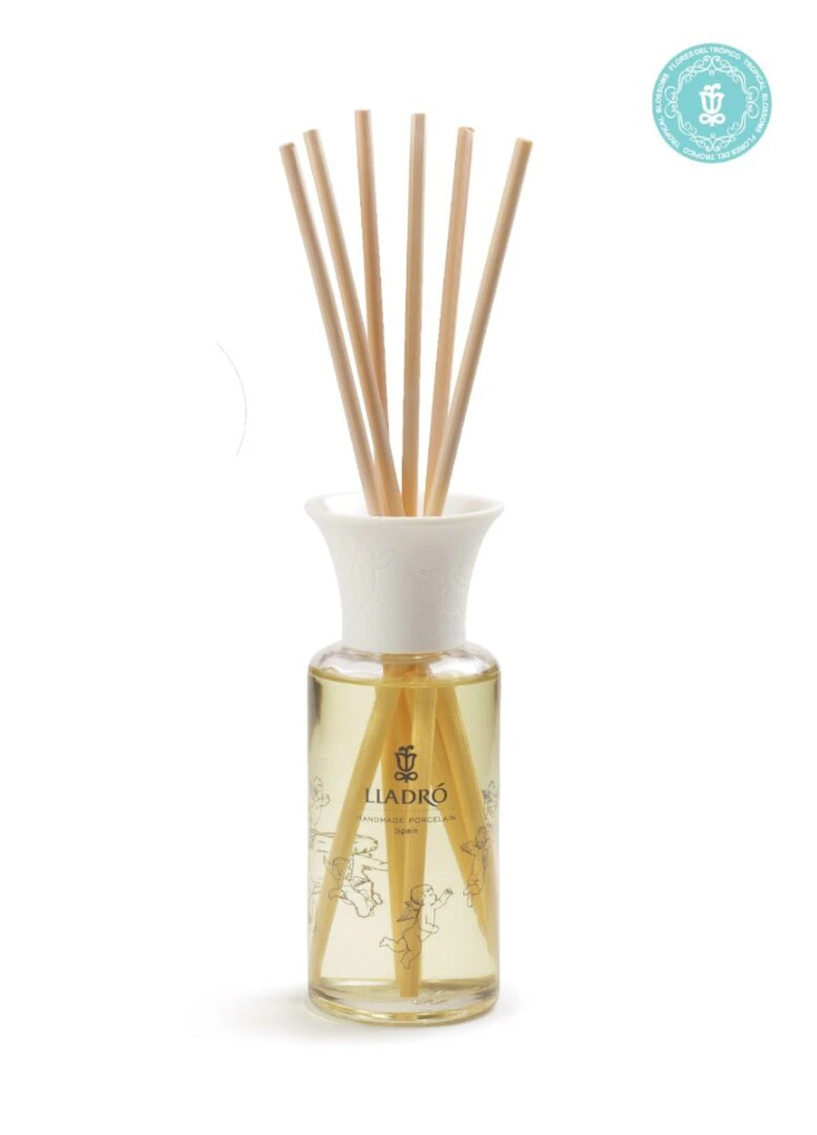 - The Heavenly Dreams collection combines exclusive aromas of Mediterranean air with a differentiated presence based on noble and natural elements with very decorative organic forms. The Matte white porcelain crown, which decorates the bottle and harmoniously collects the diffuser rods, shows an engraving of little angels, the same as the one printed on the bottle and which appears on all the elements of the Heavenly Dreams collection. This crown is varnished inside to protect it from possible splashes. Contains 200 ml (7.05 oz) of essence and six 24 cm long vegetable mikados. It lasts more than 2 months and includes up to 29% perfume in its formulation, made in Valencia, Spain.