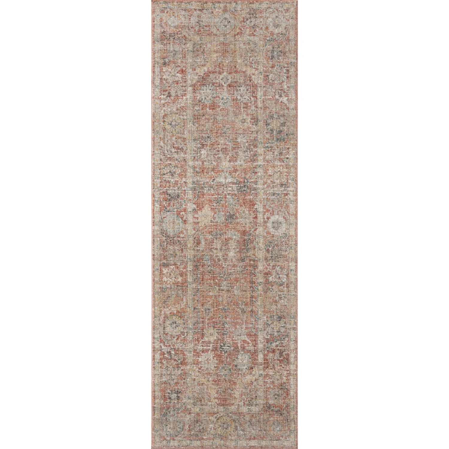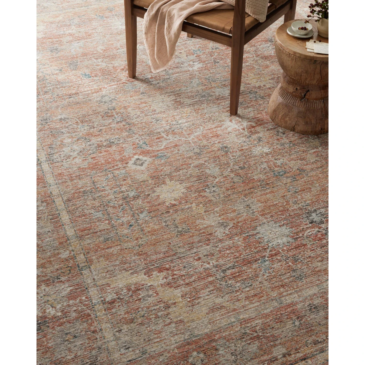 - The area rug’s muted colors create an over-dyed effect that softens the lines in the design, making it an easy piece to pair with a range of furniture and other patterns