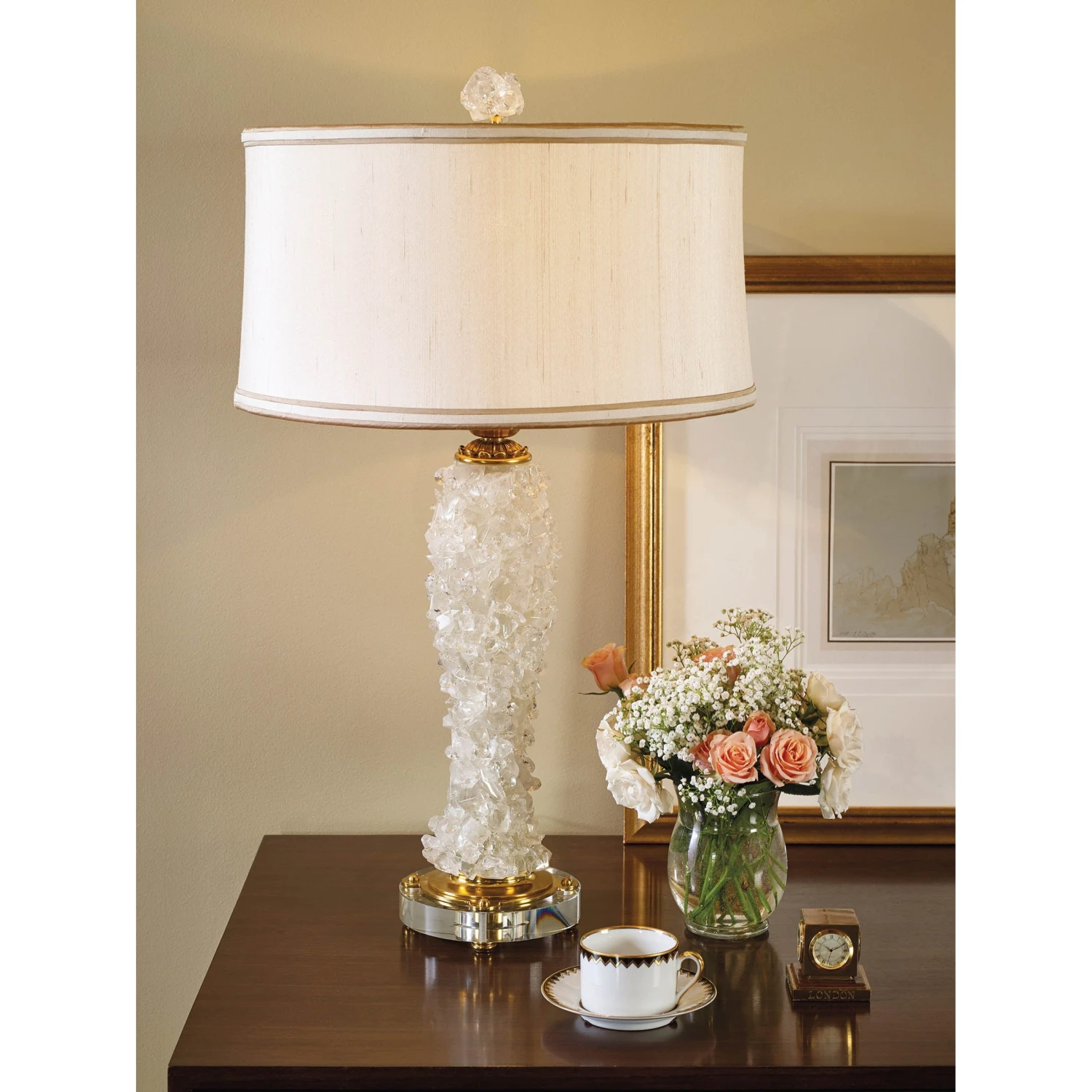 - Rock Crystal Inlaid Table Lamp with Amber Finished Brass Accents and Glass Base, Silk Shade.