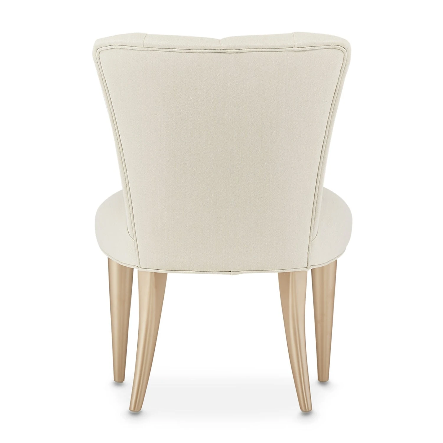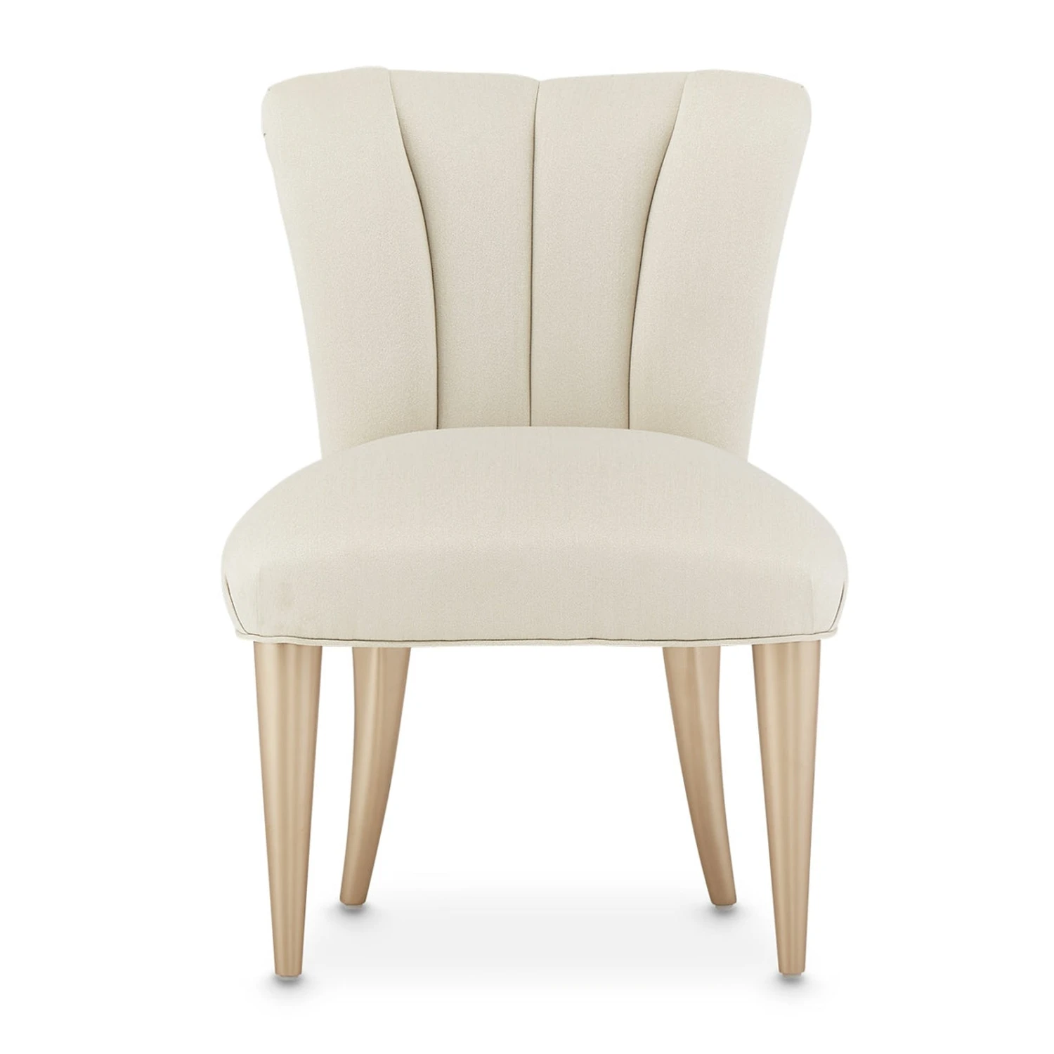 Chair is upholstered in a woven shimmery fabric with vertical channeling on the back Legs are finished in Medium Champagne with Chardonnay accents on the four legs