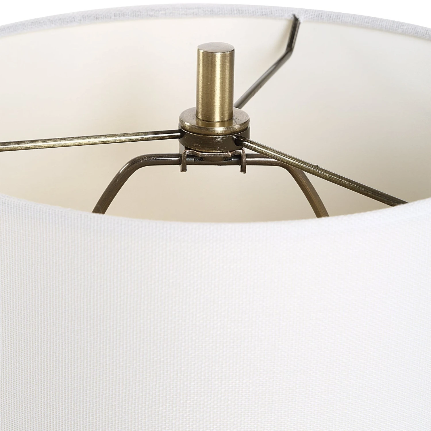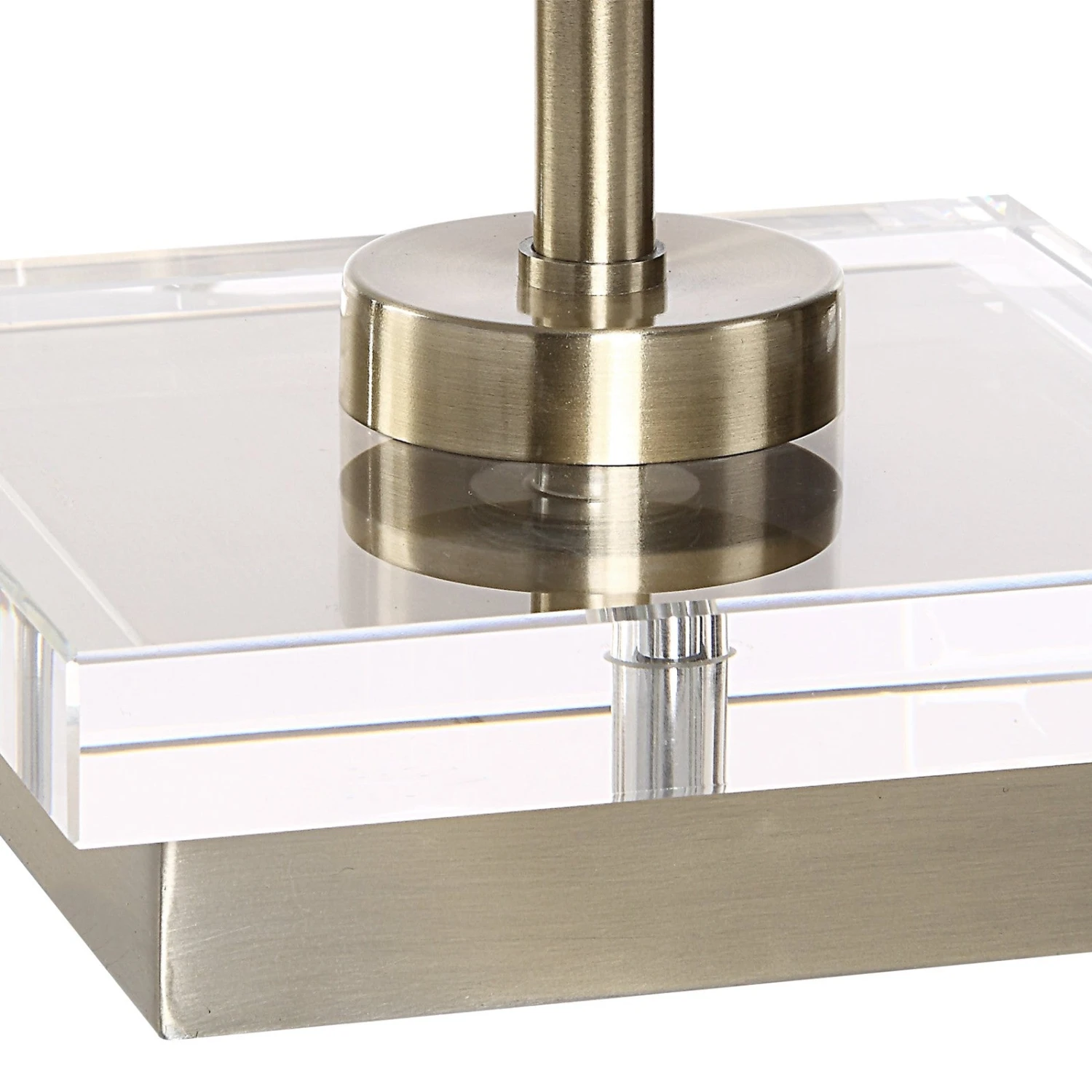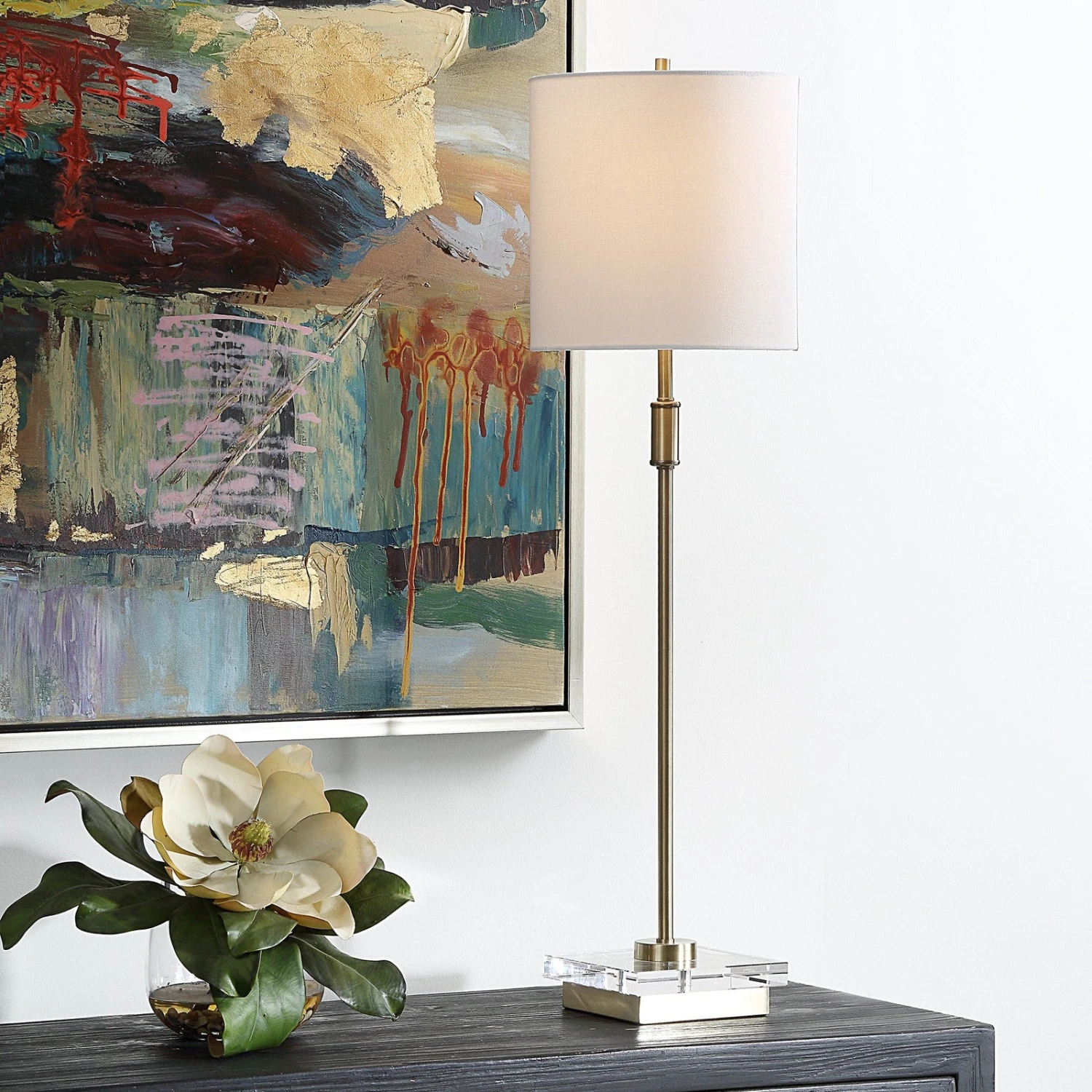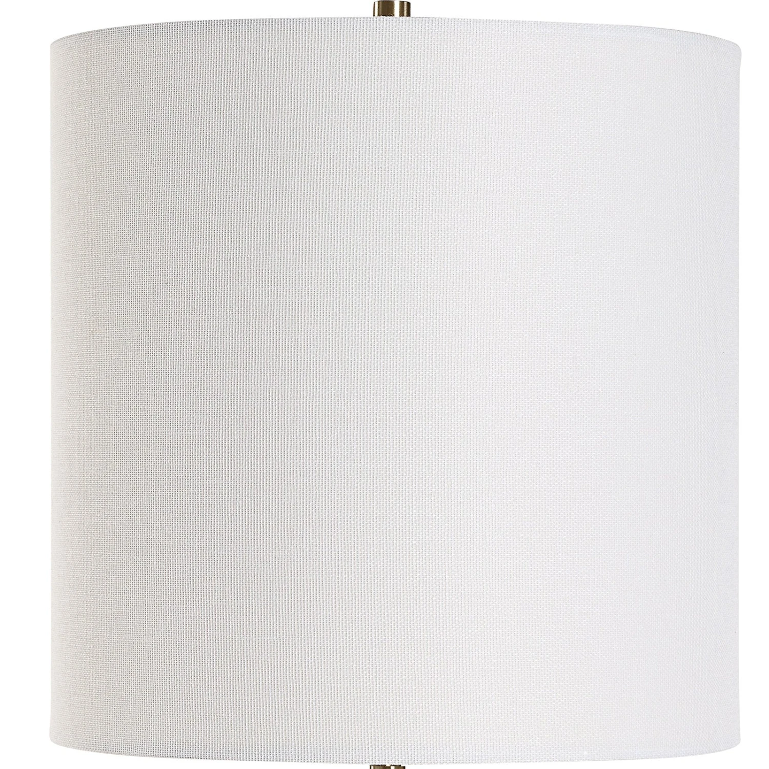 - The slender body sits atop a crystal base and a round white linen shade completes the elegant look.