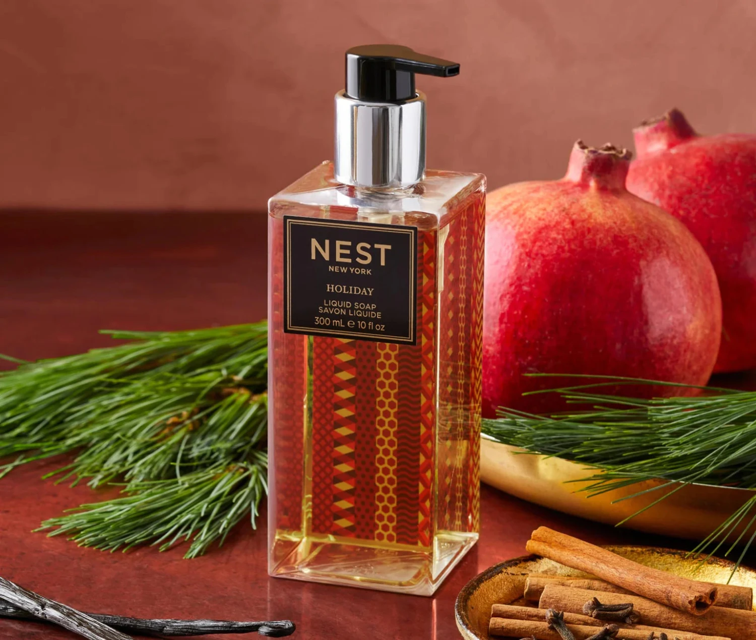 - This liquid soap features the iconic scent’s blend of pomegranate, mandarin orange, pine, cloves, and cinnamon with a hint of vanilla and amber.