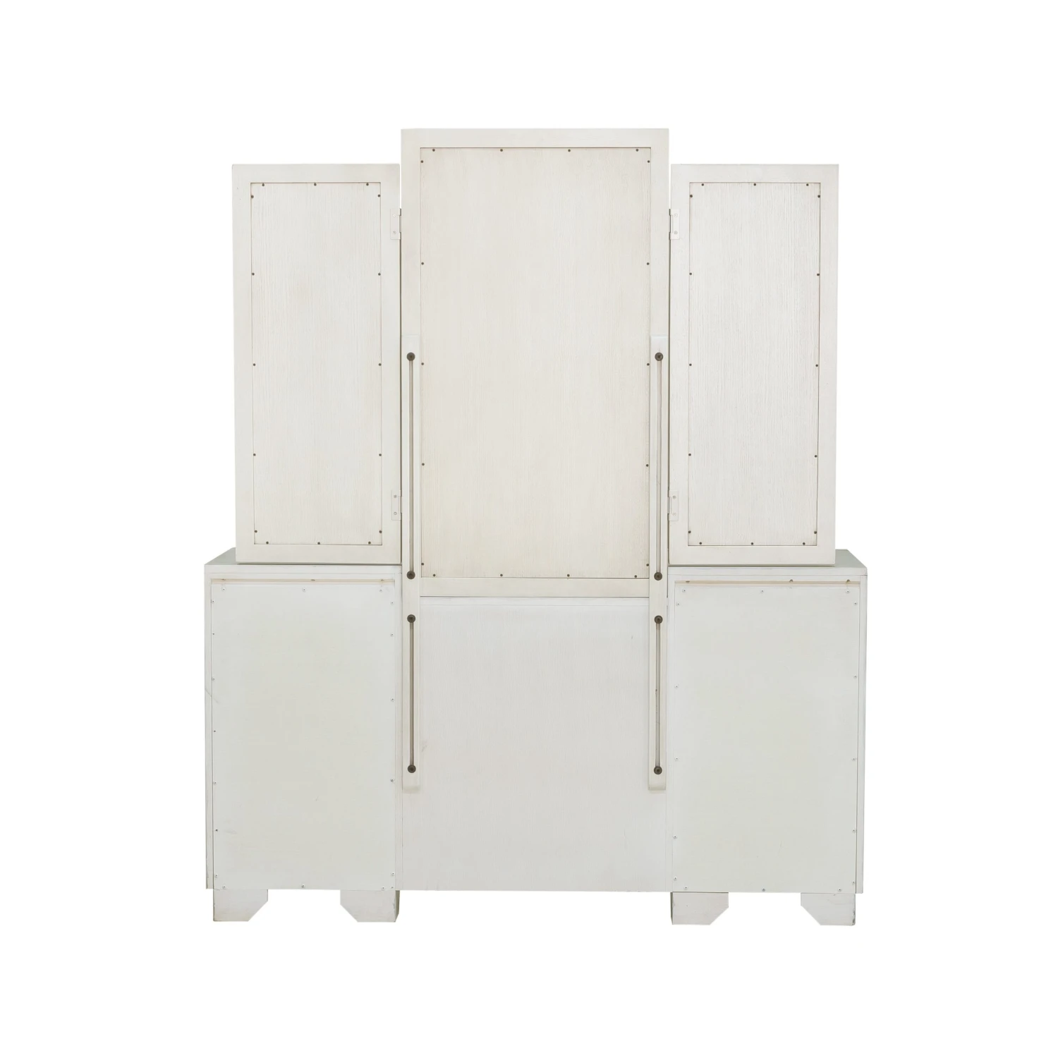 - The grand trifold Camila vanity mirror has romantic silver-tipped moldings seen throughout the bedroom collection