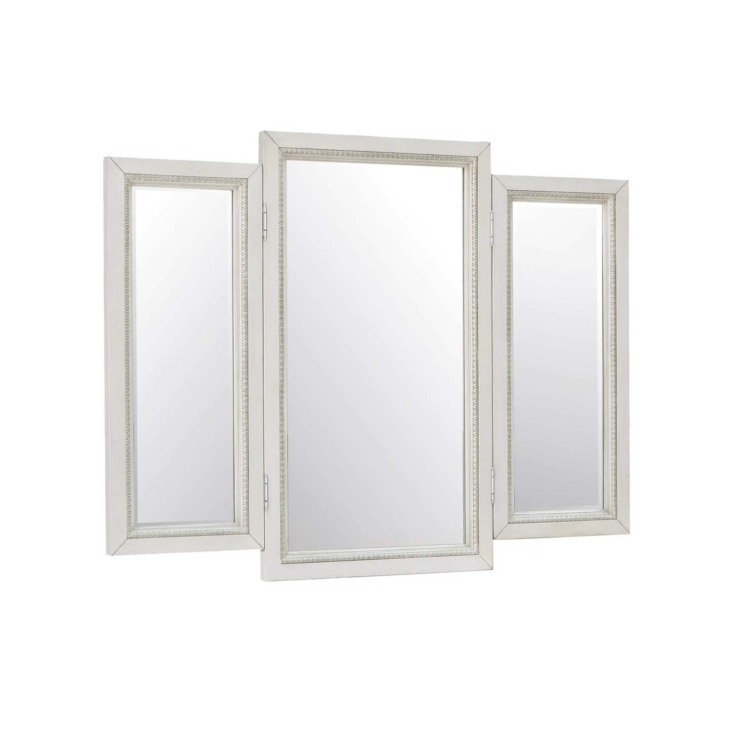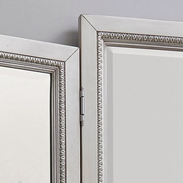 - Boasts a regal design with silver-tipped intricate molding along the border and beveled mirrors with a trifold design for multi-angle viewing