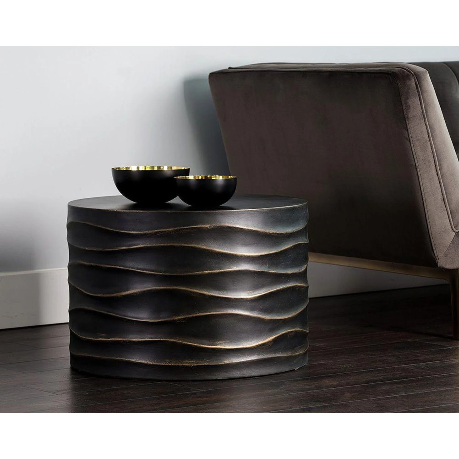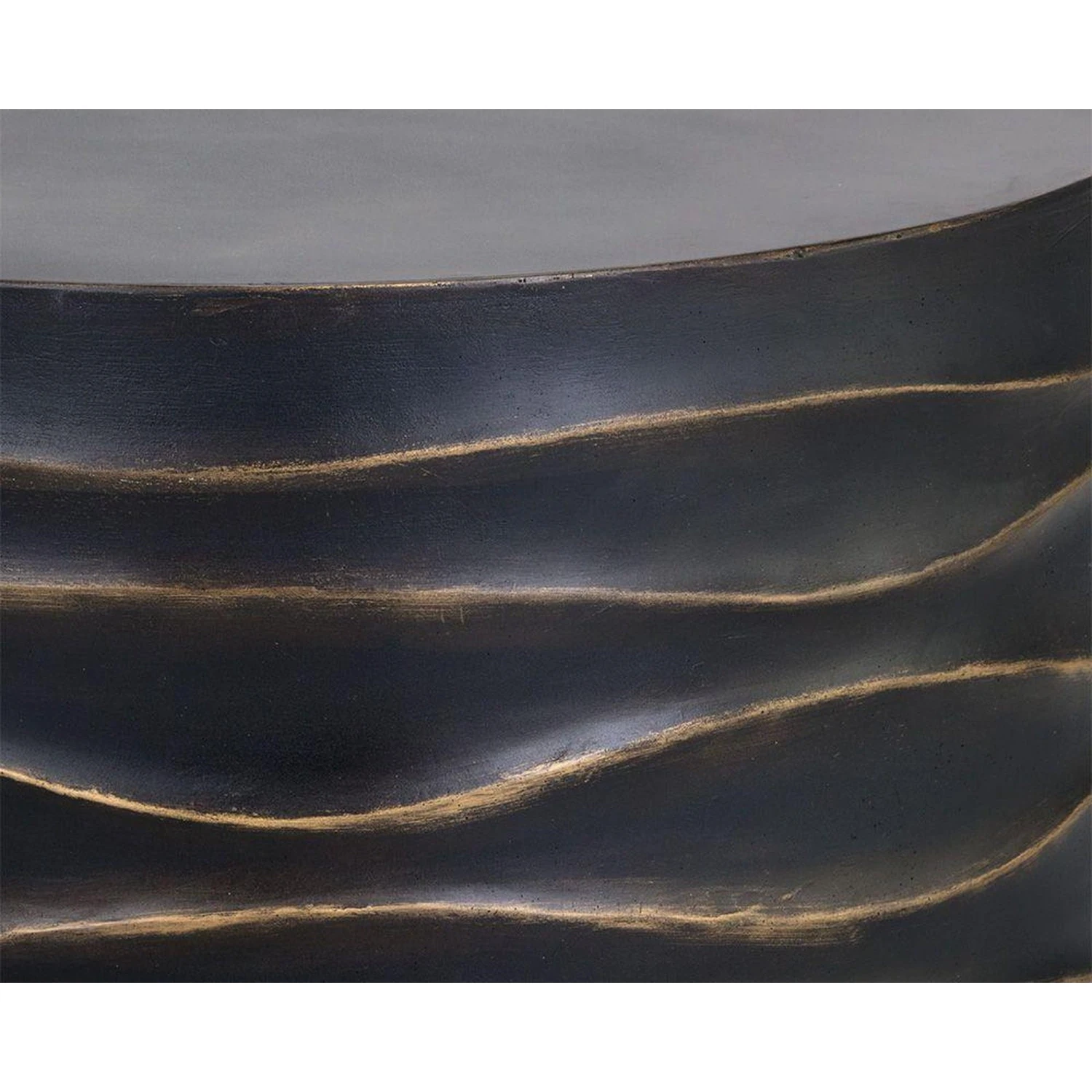 - Crafted from concrete, this piece features hand sculpted ridges with a painted brass and gold finish.