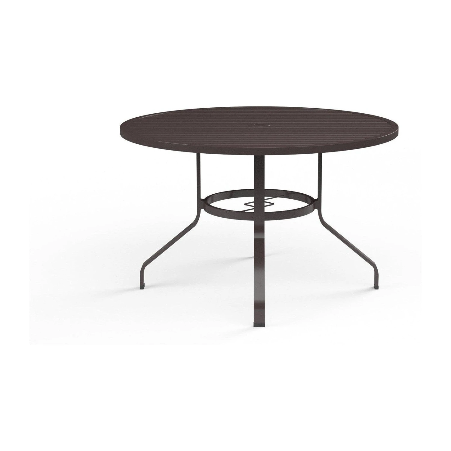 - This Dining Table features a slat top with umbrella hole, and curved channel legs.