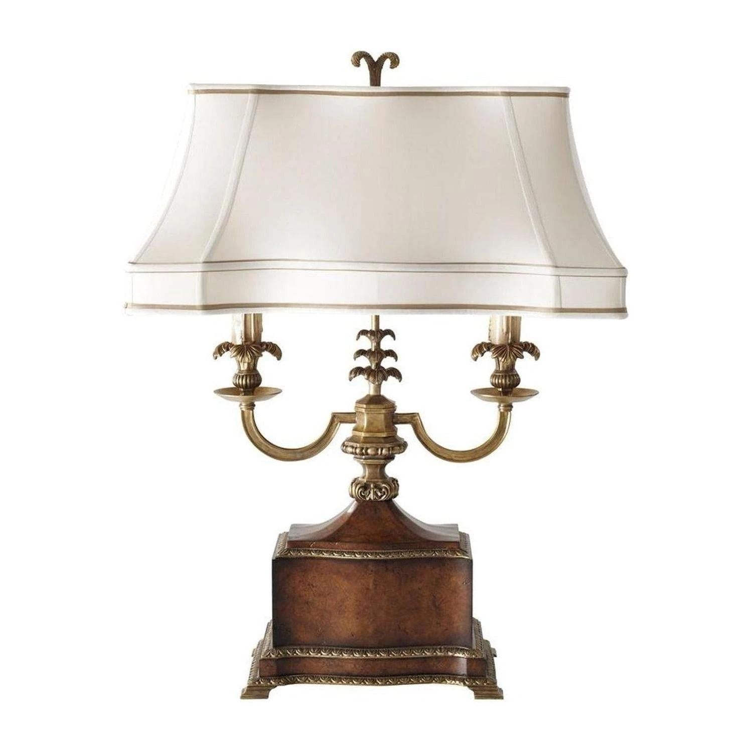 - A pollard burl and finely cast brass table lamp, the twin light arms above a shaped base with brass mounts surmounted by hand sewn silk shade.