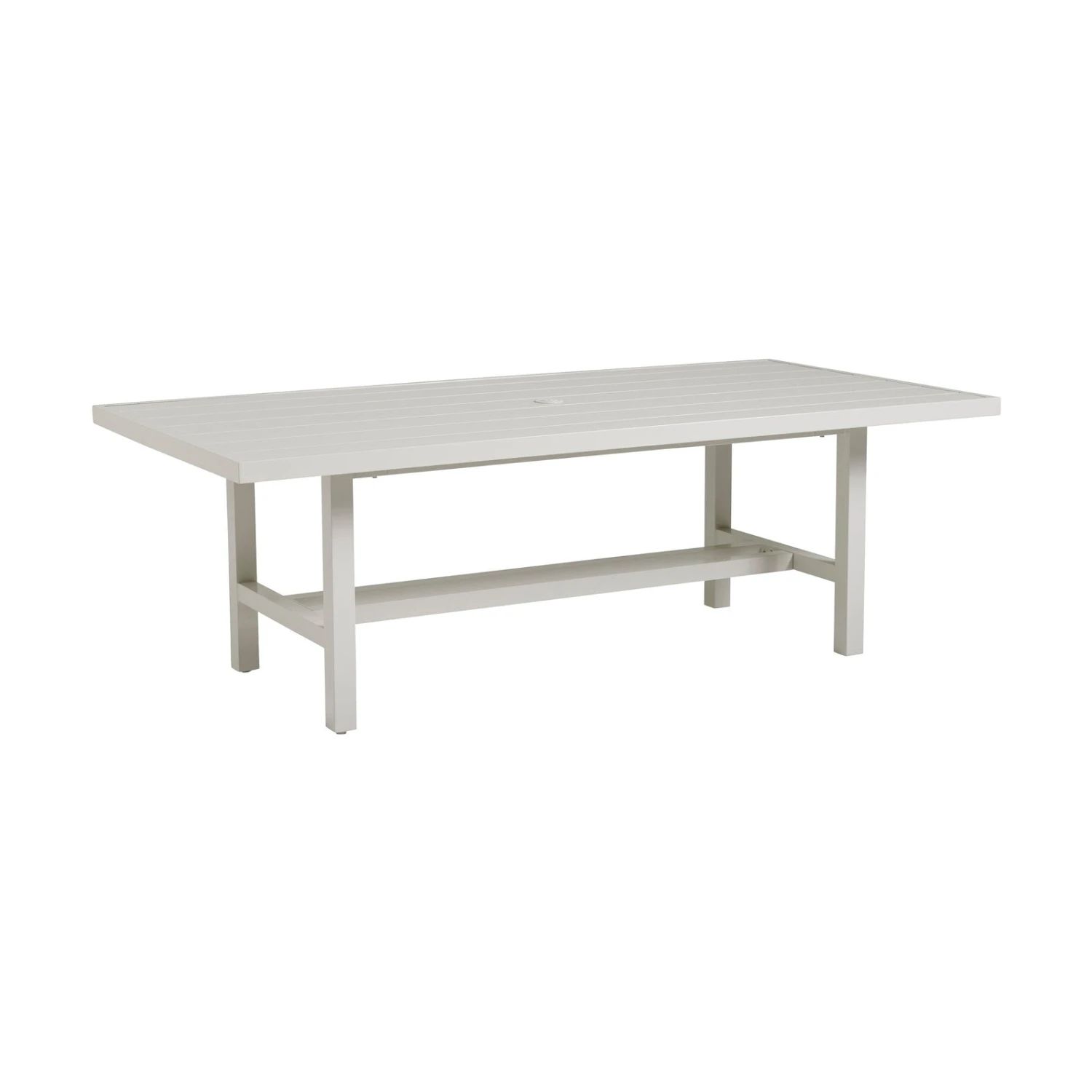 - The 88-inch rectangular dining table offers a transitional design featuring a soft oyster-white finish on an aluminum frame.