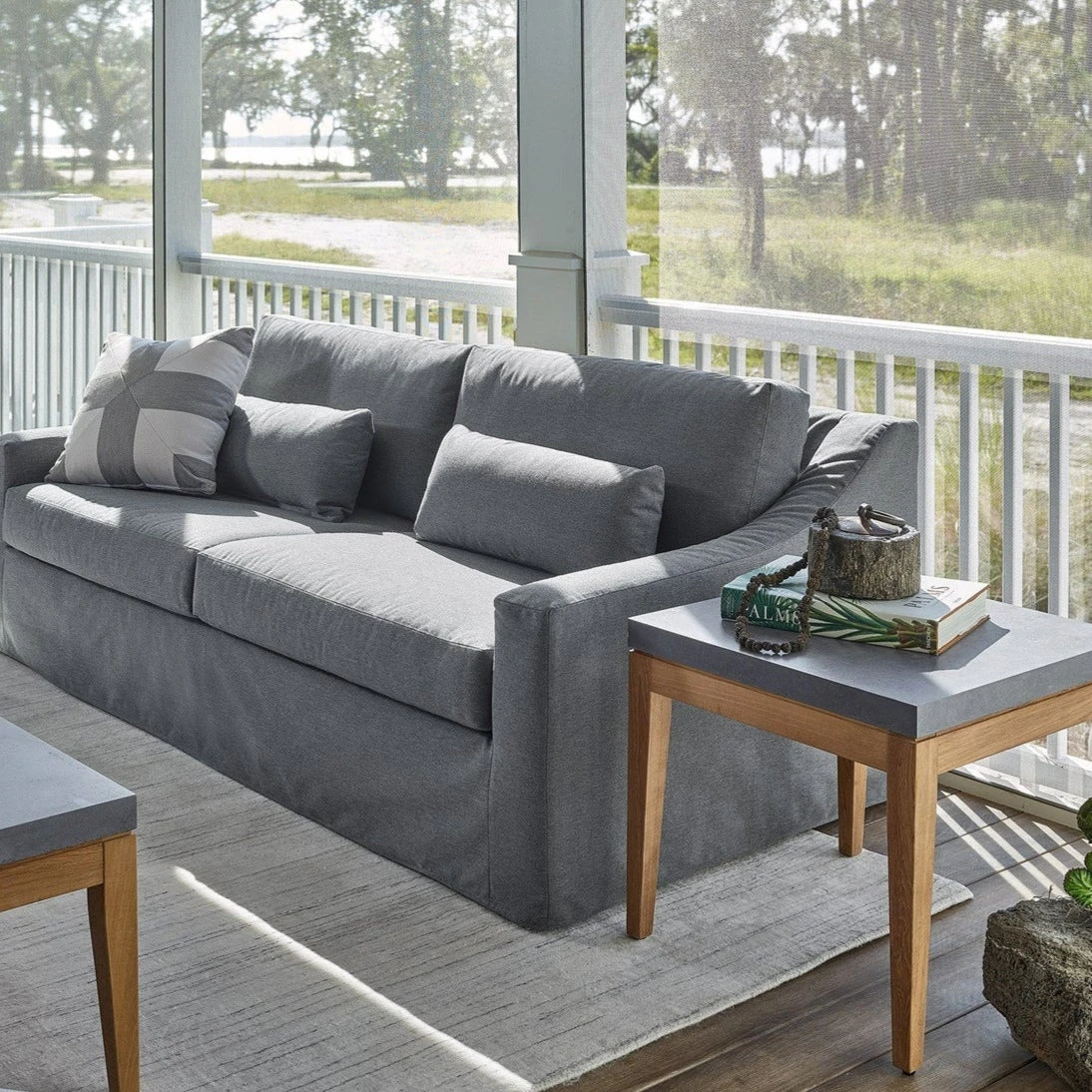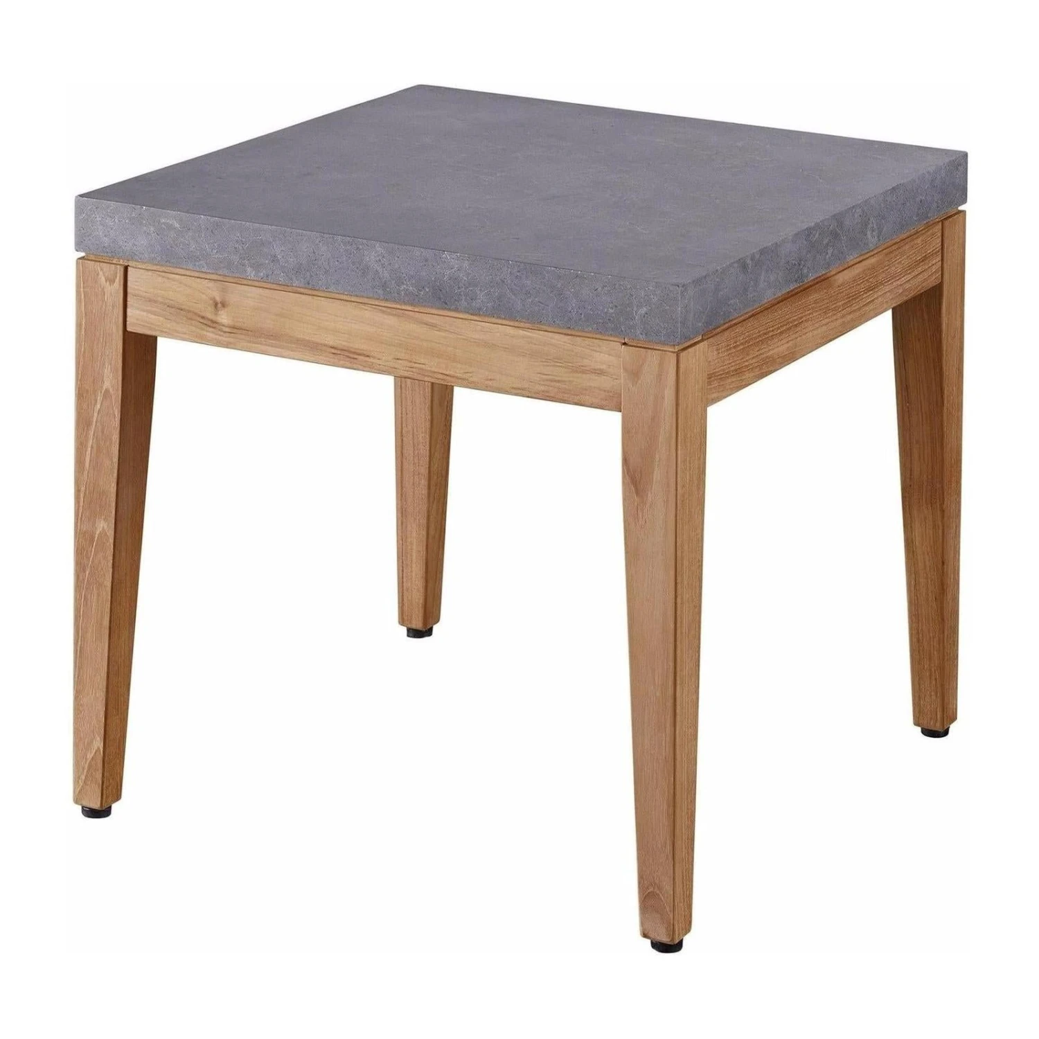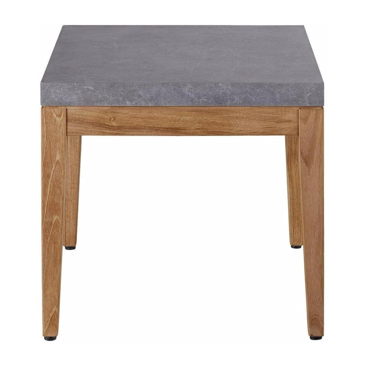 - Perfect outdoor living spaces with the Chesapeake End Table, showcasing a smooth gray stone top which is offset by a natural wooden base.