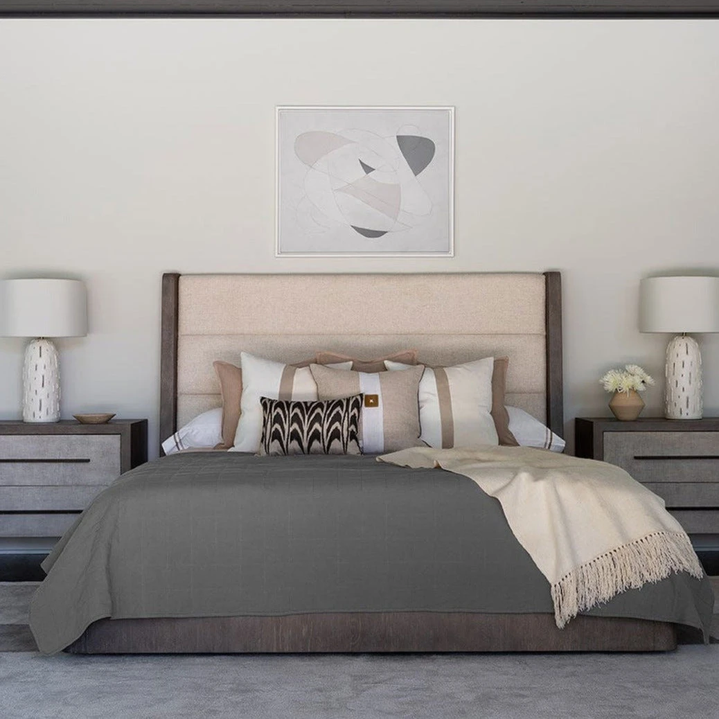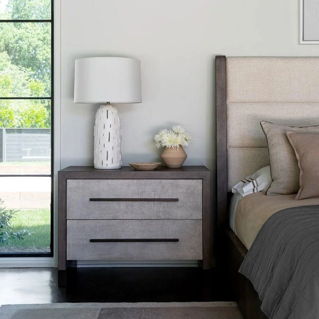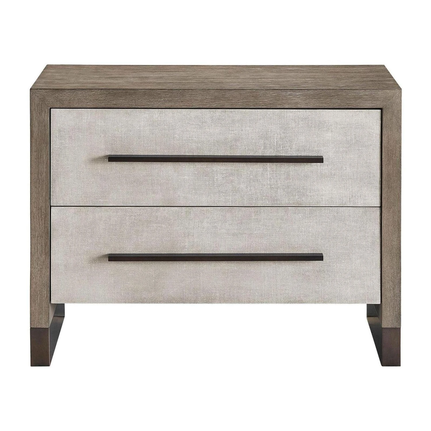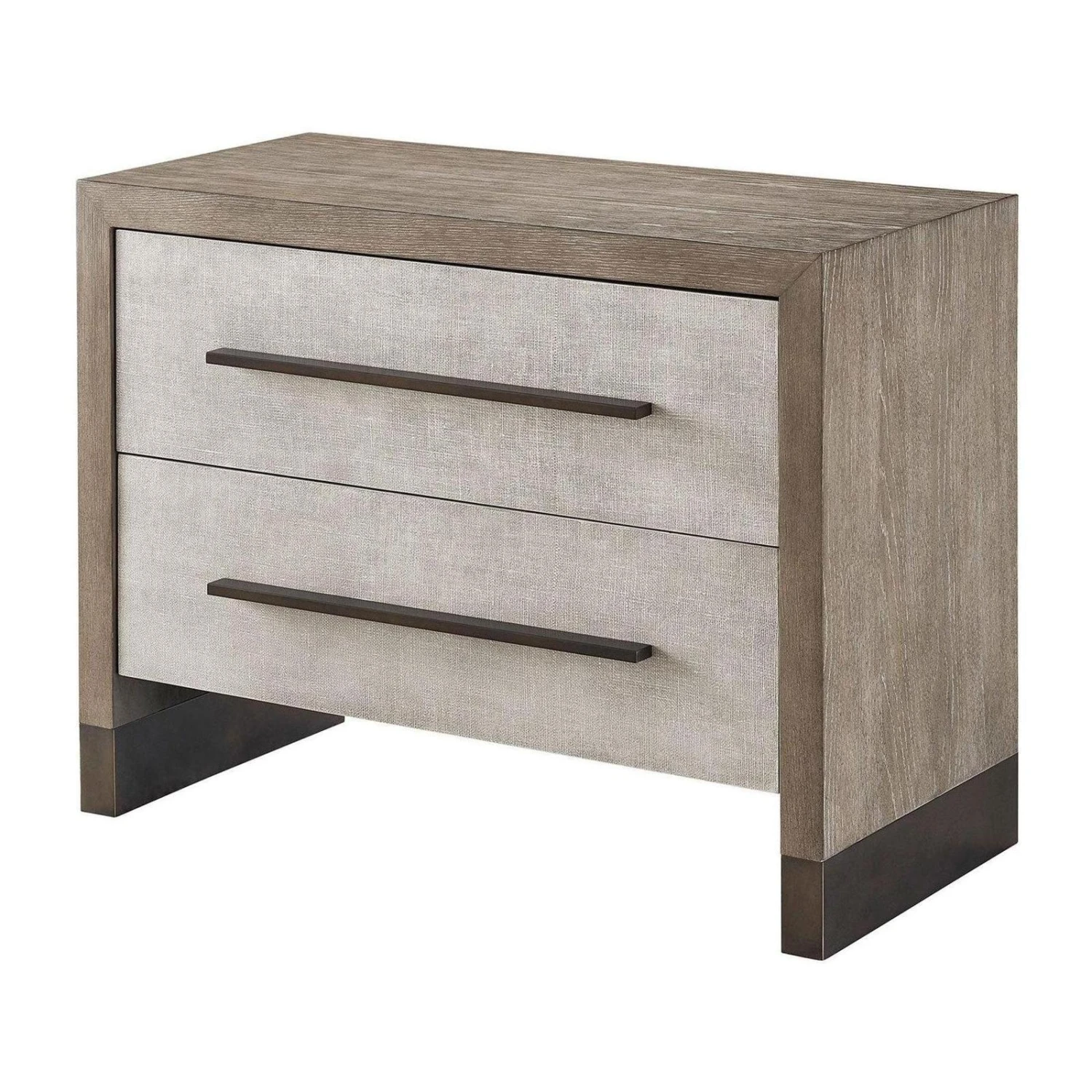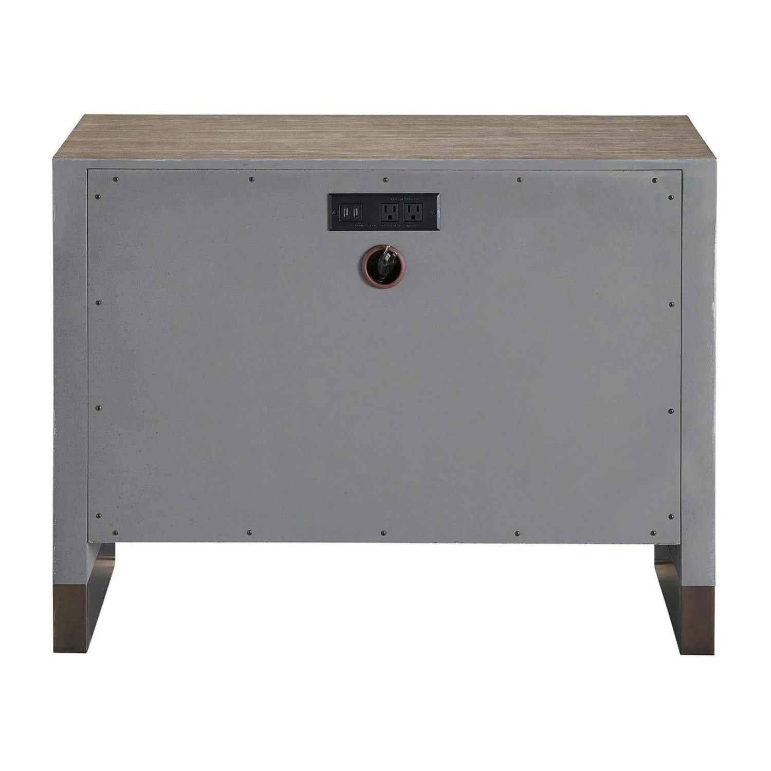 - Two spacious drawers with lightly textured faux linen drawer fronts are encapsulated by a weathered oak finish and outfitted with USB ports and outlets.