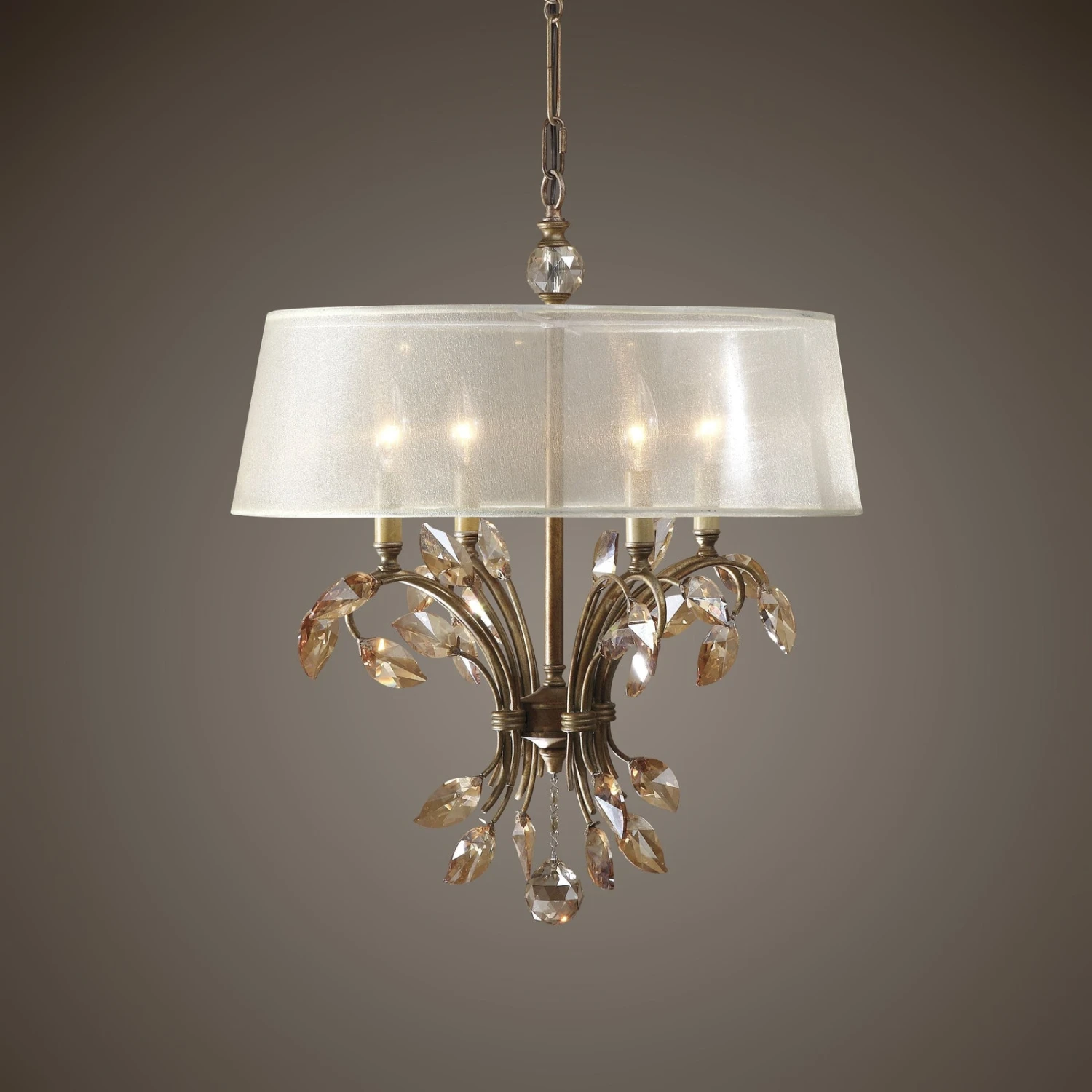 - Burnished Gold Metal With Golden Teak Crystal Leaves And A Silken Champagne Sheer Fabric Shade.