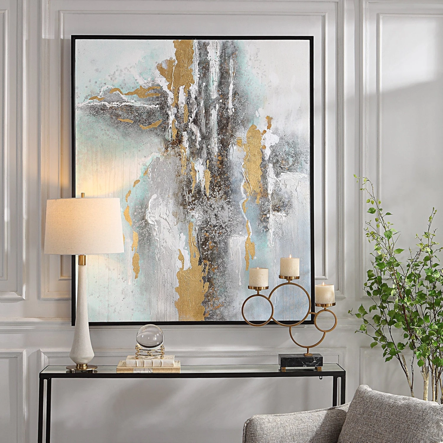 - Framed Floating Gallery Style In A Satin Black Frame With An Abstract Aqua, Charcoal And White Palette, Accented By Gold And Silver Leaf.