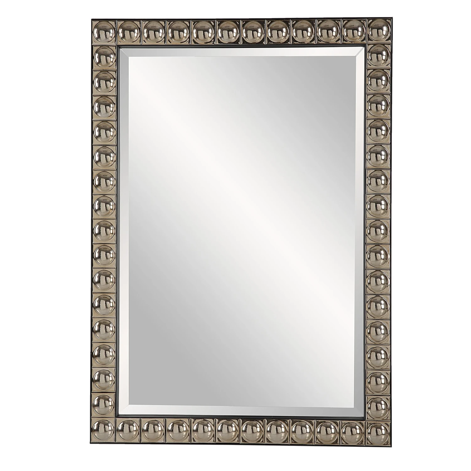 - This Unique Vanity Mirror Features Repeated Ceramic Tiles With Convexed Centers Finished In An Antiqued Silver-champagne Plating, Encased In A Black Iron Inner And Outer Frame