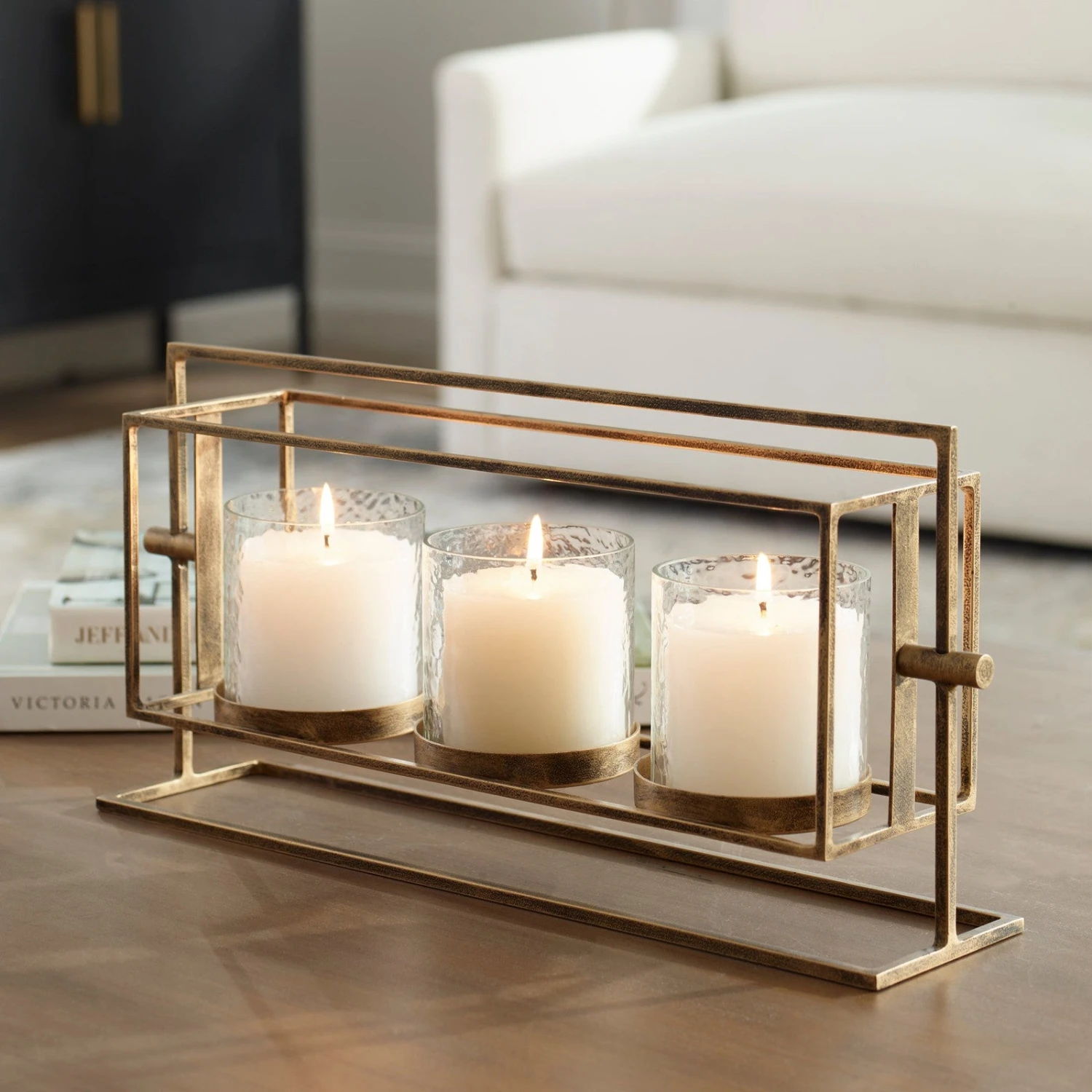 - Designed To Hold Three Pillar Candles, It Features Removable Textured Clear Glass Hurricanes And Iron Stand With Antique Gold Finish.