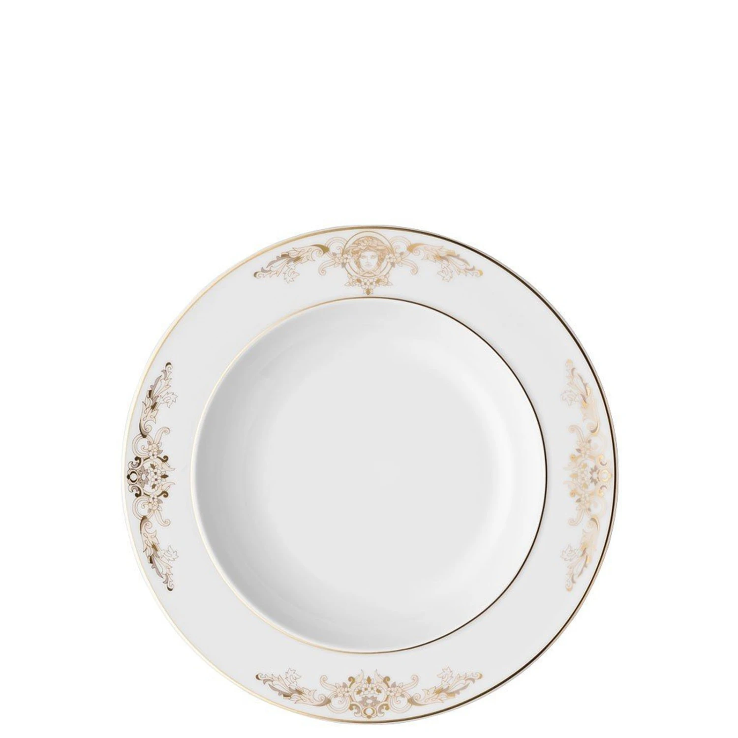 One of the first sets of the collection “Rosenthal meets Versace”, the décor “Medusa” by Gianni Versace on the form of the “Ikarus” mirrors the matchless rich, color intensive world of Versace. Central eye-catcher of this collection is a glorious gold colored head of Medusa, an unmistakably Versace emblem, framed by expressive baroque ornaments. The centrally placed head of Medusa decorates all cups, pots, service and breakfast plates of the collection “Medusa”. Varacious aristrocratic colors, bright red, precious gold and black with lavish delicate designs and ornaments give the head of Medusa a colorful elegant framework. The collection “Medusa” consists of a complete dining and coffee set and many accessoires. Big breakfast cups for Cappucino and Café au Lait, pasta plates and cereal bowls complement the collection as well as precious, personal gift accessoires like napkin rings, candle holders, vases and a classy smokers-set. The two glass series “Medusa Lumière” and “Méandre”, as well as the cutlery collection “Medusa Gold”, complete an elegant and colorful table culture in the unique world of Versace.