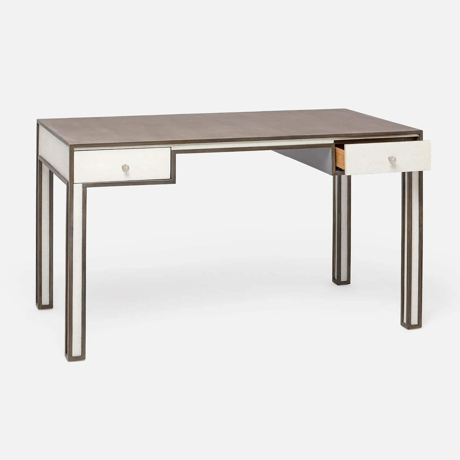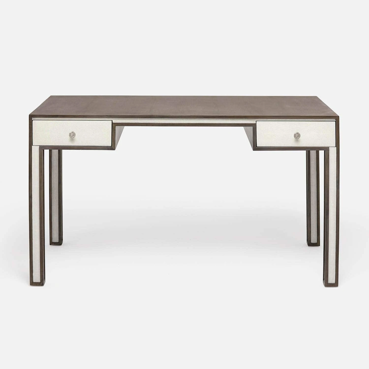 - Gray-stained oak and vintage faux shagreen make up the unexpected pairing that creates the Wolfred’s defined look.