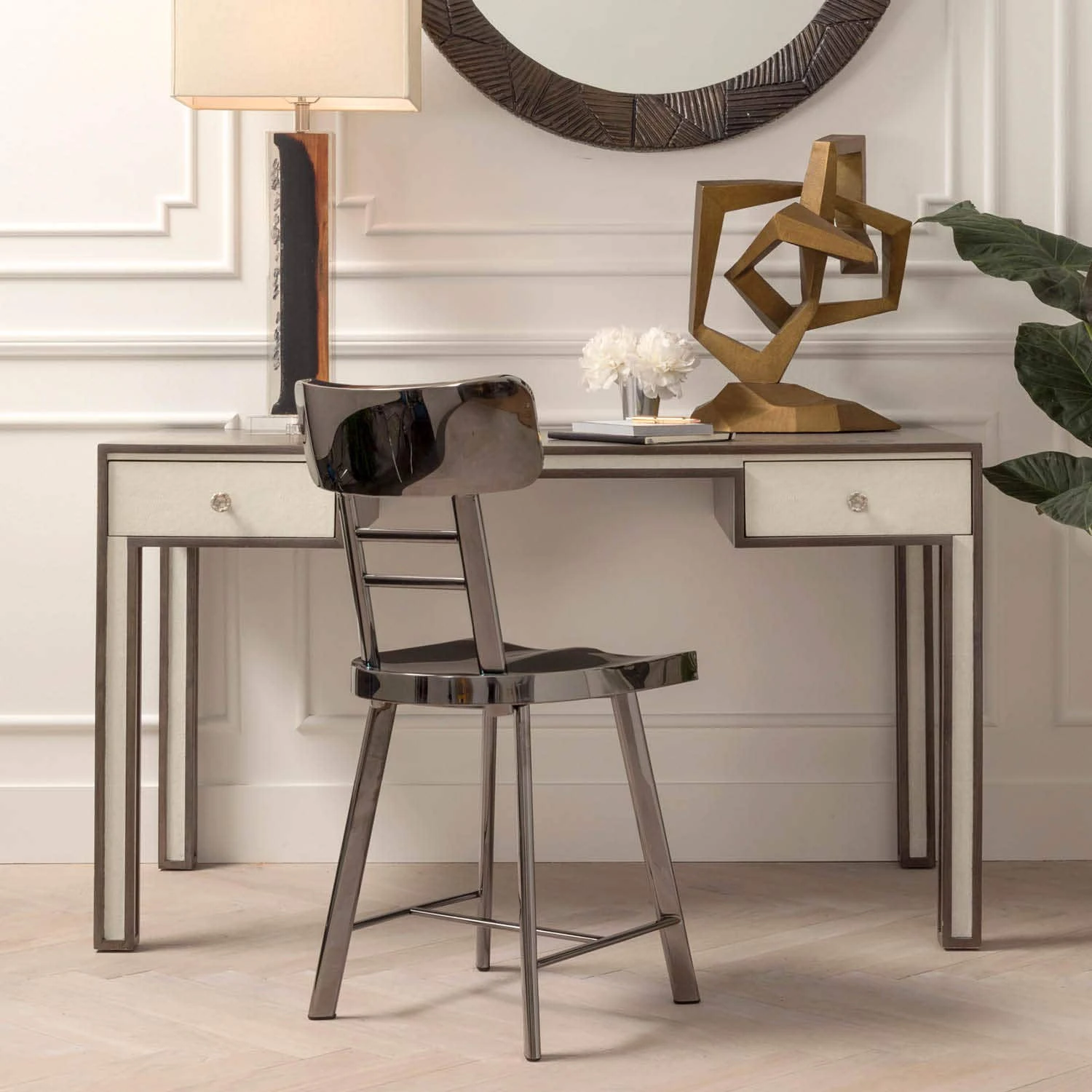 - The pared down silhouette is highlighted by the wood trim; shagreen adds a contrasting texture.